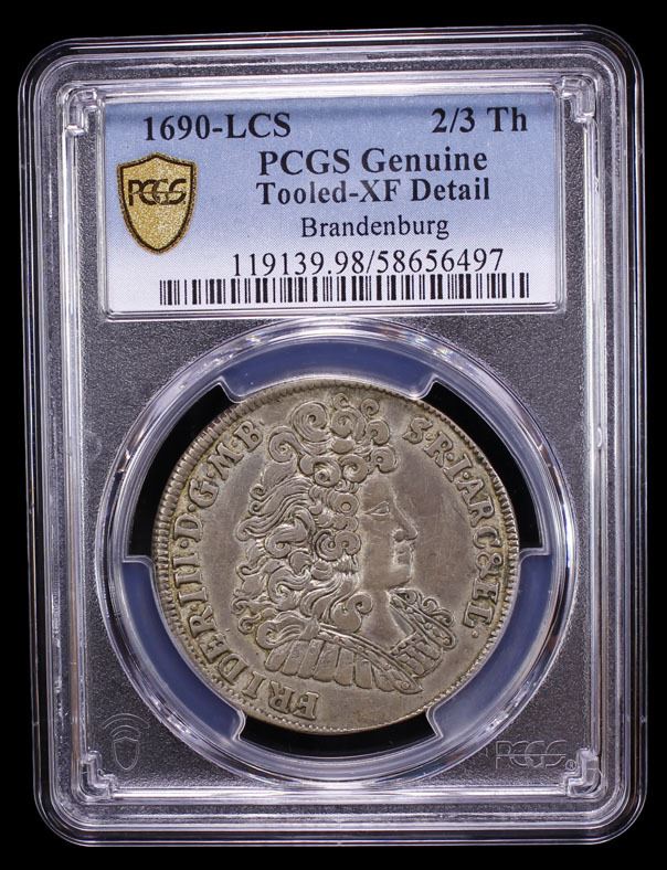 BRANDENBURG-PRUSSIA: Friedrich III, 1688-1701, AR 2/3 thaler, Berlin, 1690, KM-556, mint master initials LCS, tooled, PCGS graded XF details.