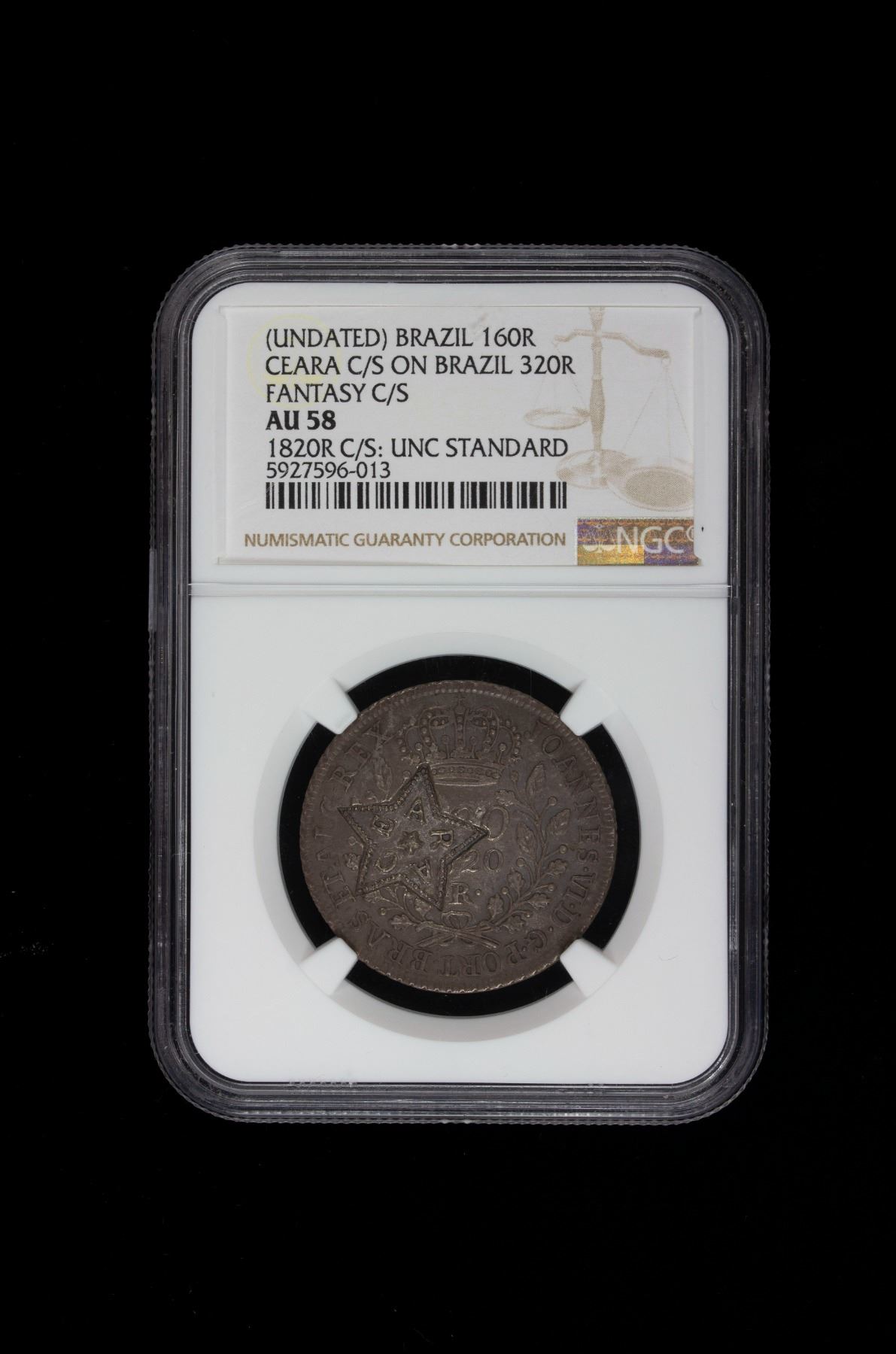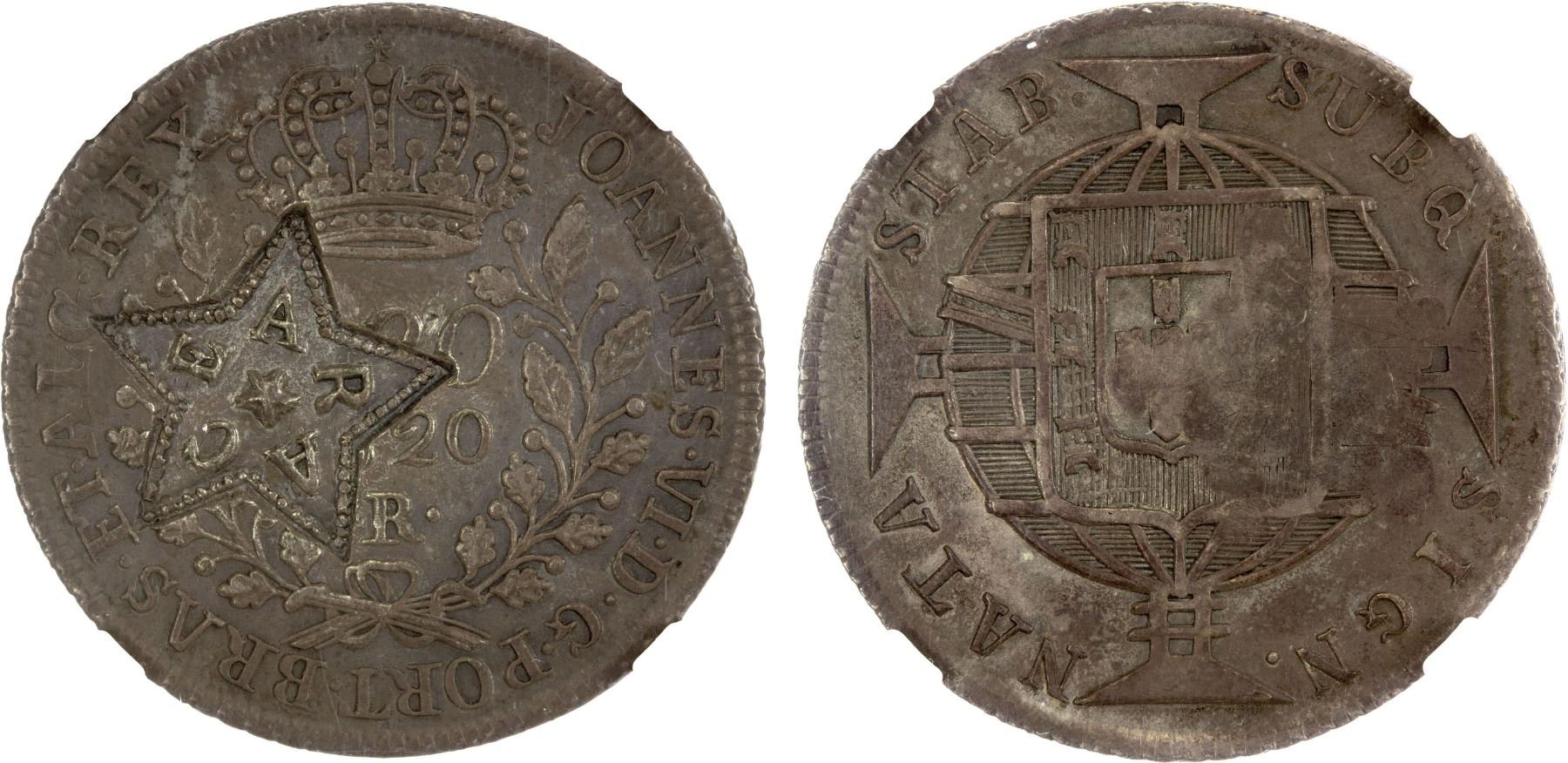 BRAZIL: CEARA: State, AR 160 reis, ND (1833-4), fantasy countermark on 1820R Brazil 320 reis host, toned host and countermark, NGC graded AU58. WINGS, RRR. The consignor (and we agree) that this countermark on this host may be unique.