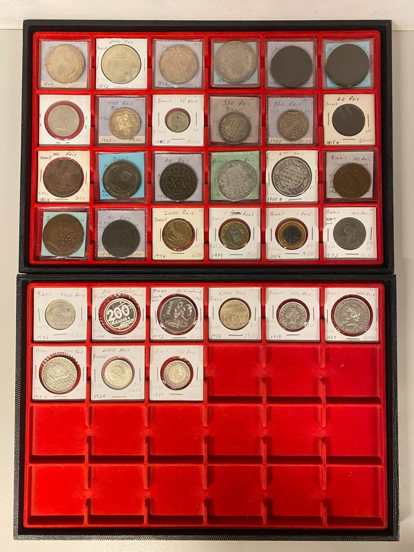 BRAZIL: LOT of 33 coins, including 9 of Portugal (320 reis (2), 640 reis (2), a holed and plugged 1755 75 reis and 4 copper coins), 3 coppers of the united kingdom, 8 of the empire (1,000 reis (2), 2,000 reis (4), and 2 coppers), 5 silver coins of the 1st republic, and 8 modern issues (4 silver); retail value $800, lot of 33 pieces.
