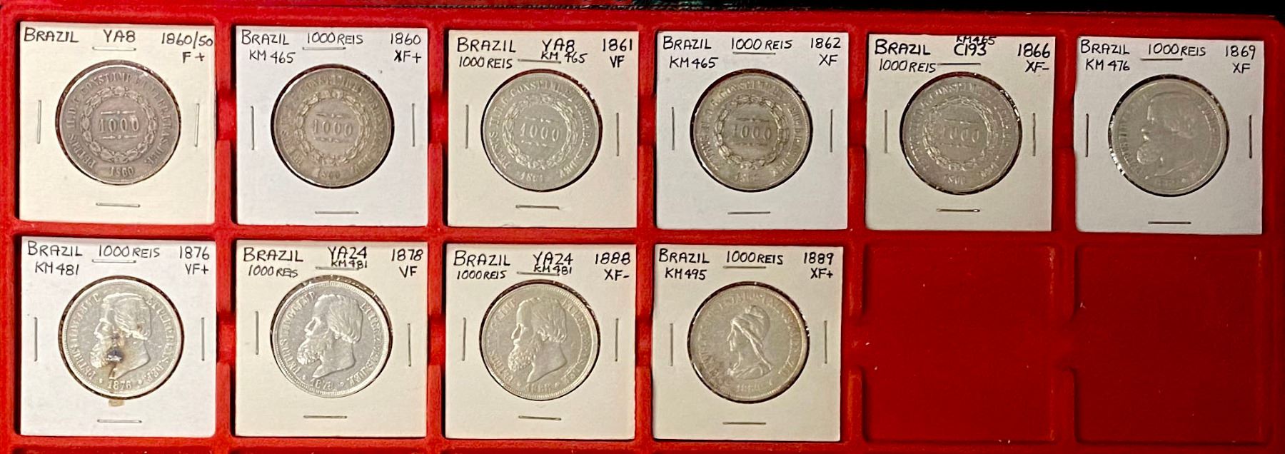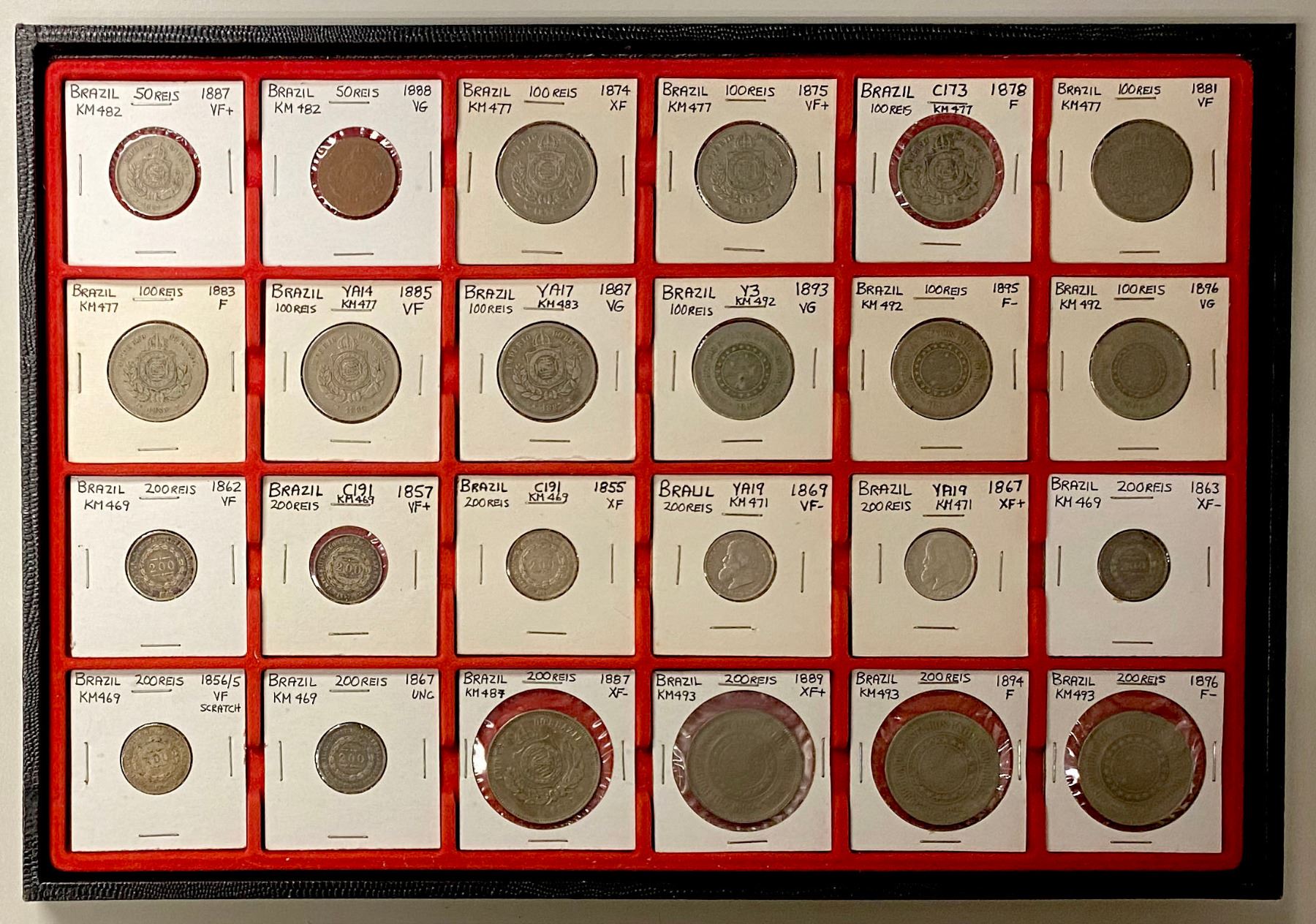 BRAZIL: LOT of 58 coins, including 50 reis (2 pcs), 100 reis (10), 200 reis (14), 500 reis (16), and 1000 reis (16); average circulated grades, some lightly cleaned, most are silver, in consignor's 2x2 holders, viewing recommended; retail value $1025, lot of 58 pieces, ex Almer H. Orr III Collection.
