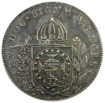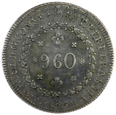 BRAZIL: Pedro I, 1822-1831, AR 960 reis, Rio de Janeiro, 1827, KM-368.1, overstruck on same coin of 1827, perhaps double-striking during production of this piece, PCGS graded AU50, RR. The date 1827 is partly weak, but absolutely clear when carefully viewed with small magnification.An example of 1827 Rio de Janeiro 960 reis, graded XF-45 by NGC, fetched $4500 in the Heritage NY Signature Sale 3012, lot 23323, in January 2011.