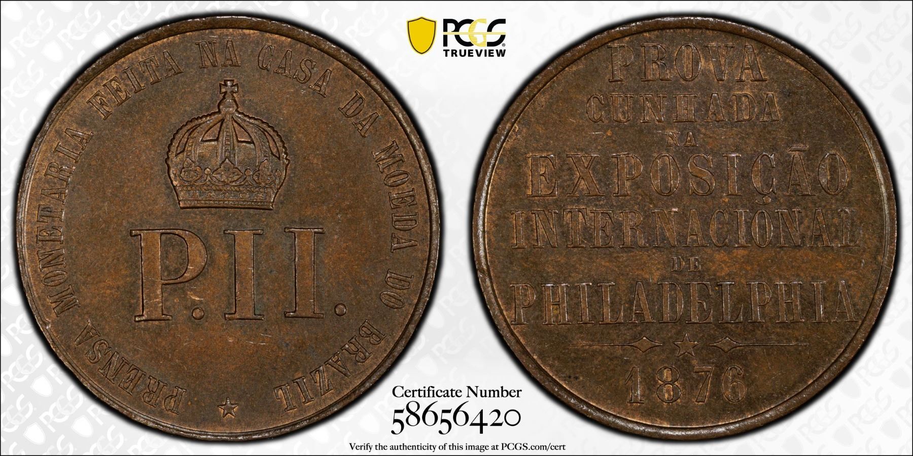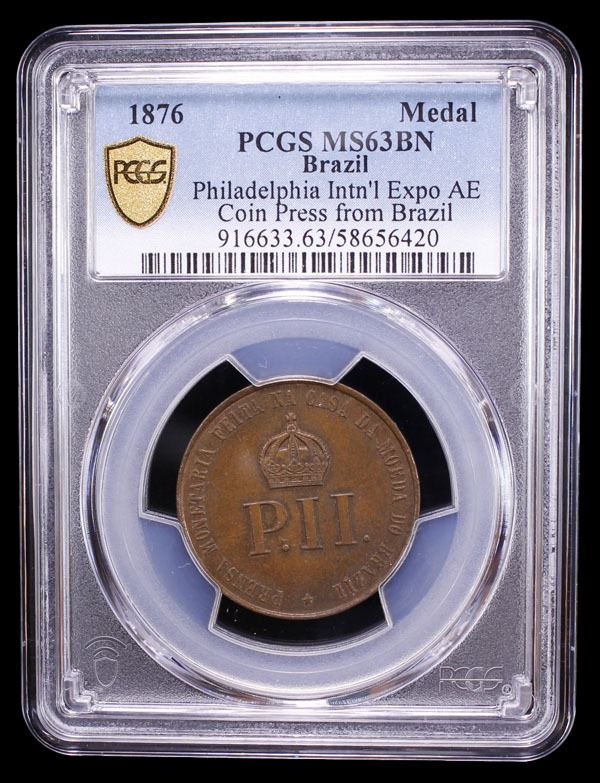 BRAZIL: Pedro II, 1831-1889, AE medal (10.04g), 1876, VC-122, BM-1, 27mm, Brazil mint press test strike at the Centennial International Exhibition, Philadelphia; PRENSA MONETARIA FEITA NA CASA DA MOEDA DO BRAZIL around crowned P. II. monogram // PROVA CUNHADA NA EXPOSICAO INTERNACIONAL DE PHILADELPHIA 1876, a lovely mint state example! PCGS graded MS63 BN. This medal was struck in the Main Building during the Centennial International Exhibition of 1876 in Philadelphia. The Centennial International Exhibition of 1876, the first official World's Fair in the United States, was held in Philadelphia, Pennsylvania, from May 10 to November 10, 1876, to celebrate the 100th anniversary of the signing of the Declaration of Independence in Philadelphia. It was officially named the International Exhibition of Arts, Manufactures, and Products of the Soil and Mine. Nearly 10 million visitors attended the exposition, and 37 countries participated in it.