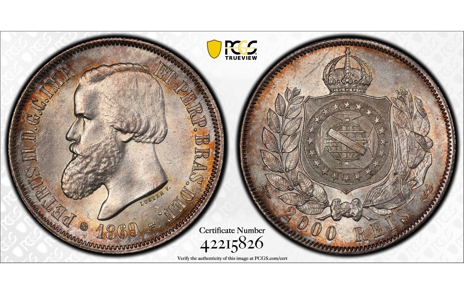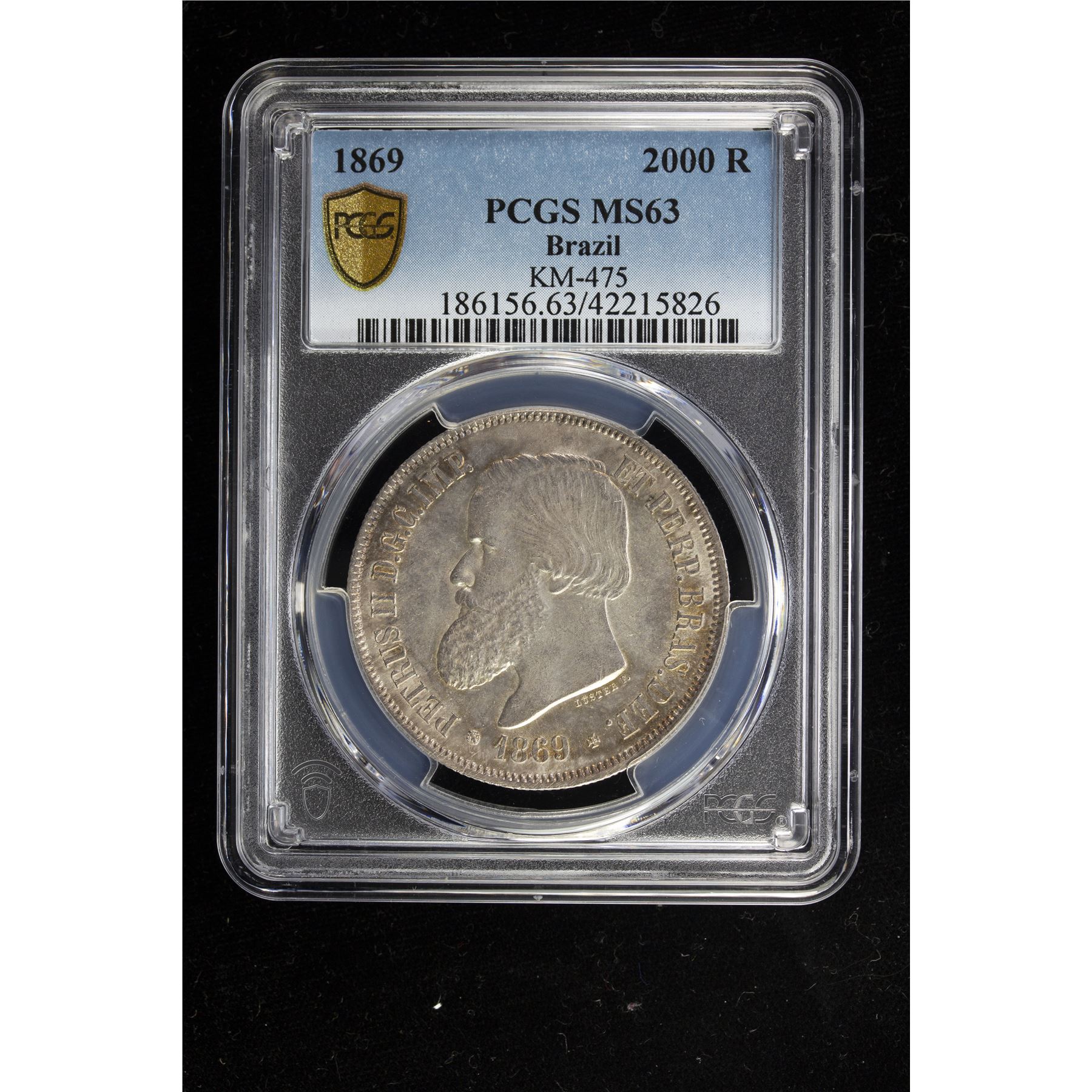 BRAZIL: Pedro II, 1831-1889, AR 2000 reis, 1869, KM-475, a lovely lightly toned example! PCGS graded MS63.
