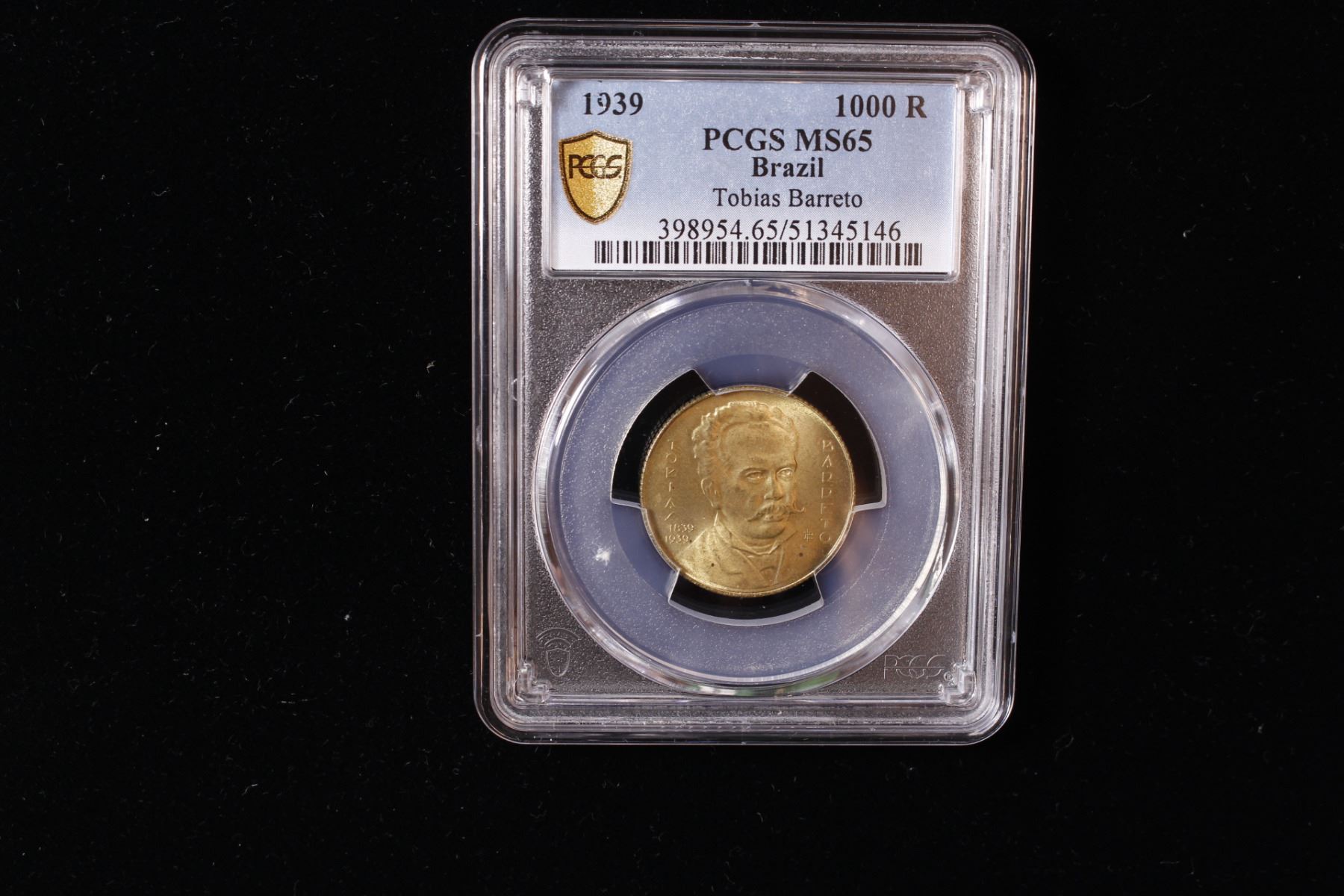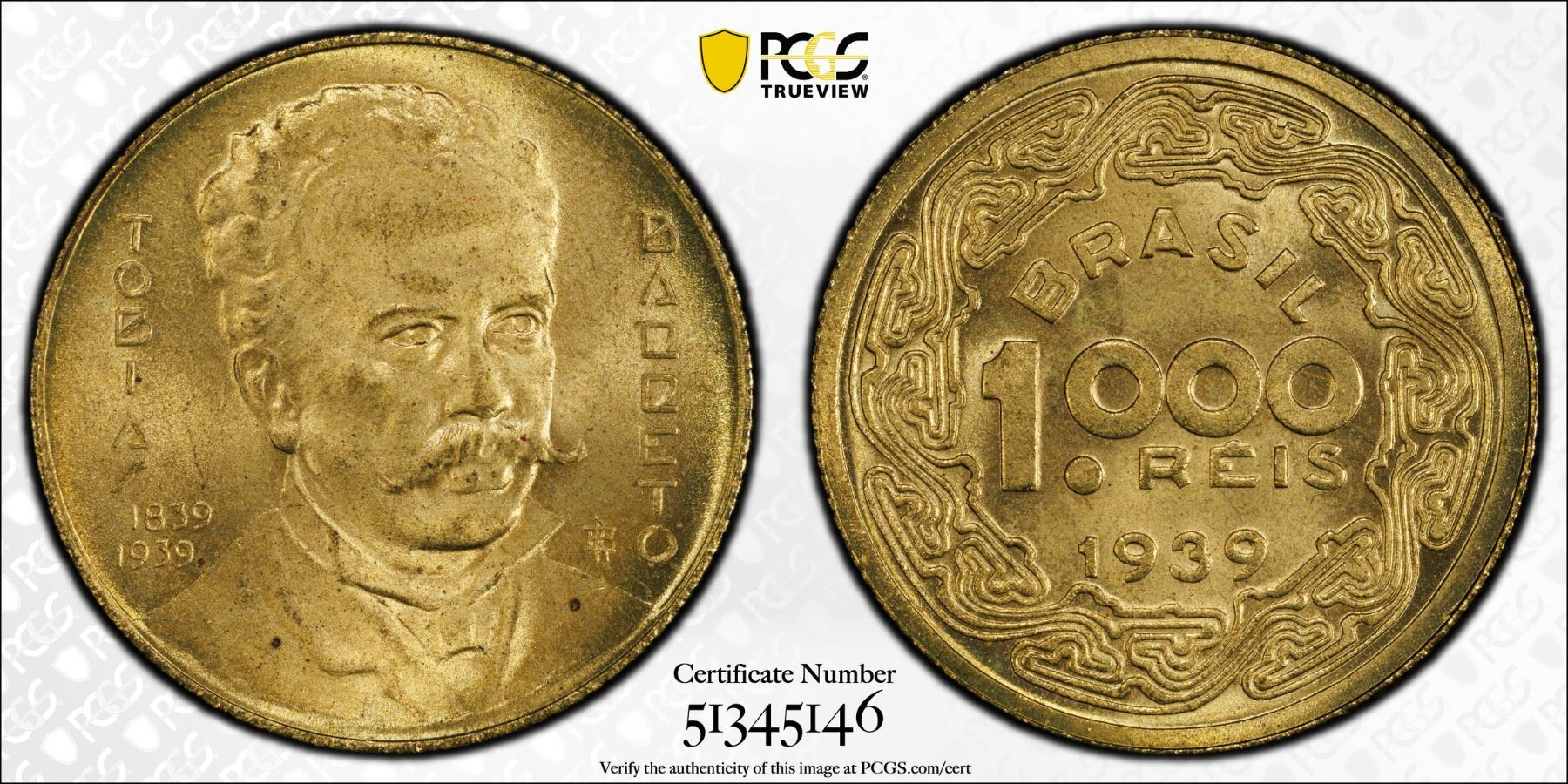 BRAZIL: Republic, 1000 reis, 1939, KM-550, Tobias Barreto de Meneses, PCGS graded MS65. Tobias Barreto de Meneses (1839–1889) was a Brazilian poet, philosopher, jurist and literary critic. He is famous for creating the "Condorism" and revolutionizing Brazilian Romanticism and poetry.