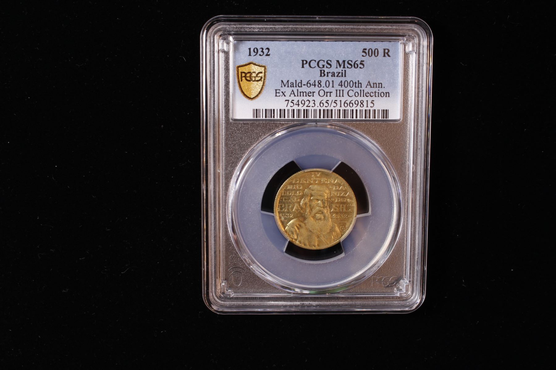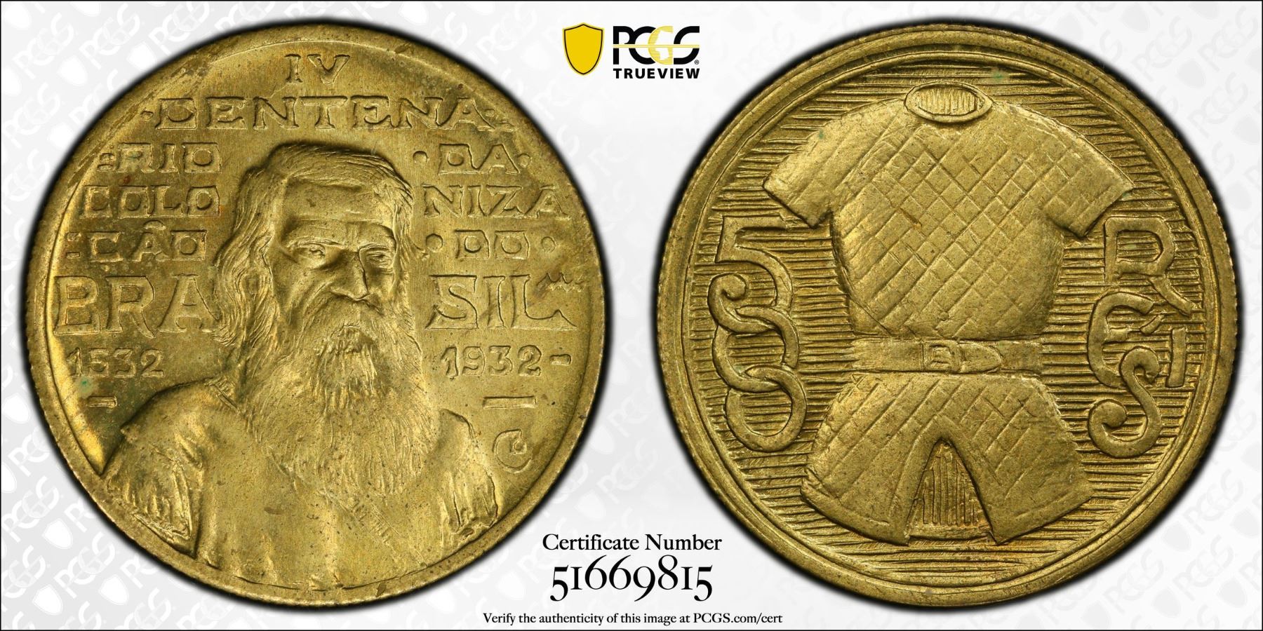 BRAZIL: Republic, 500 reis, 1932, KM-530, Y-42, 400th Anniversary of Colonization - João Ramalho, PCGS graded MS65, ex Almer H. Orr III Collection.