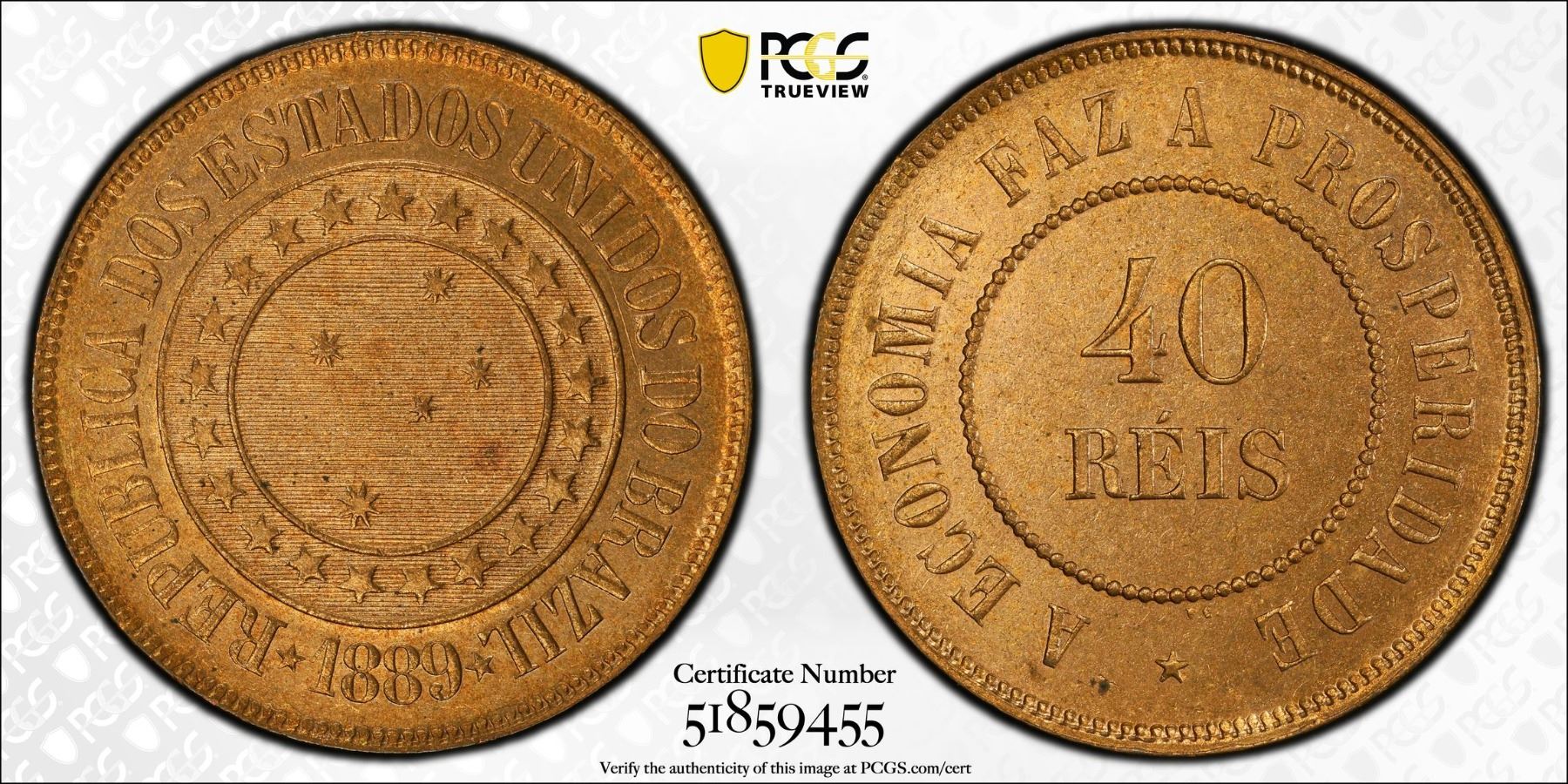 BRAZIL: Republic, AE 40 reis, 1889, PCGS MS63 RD