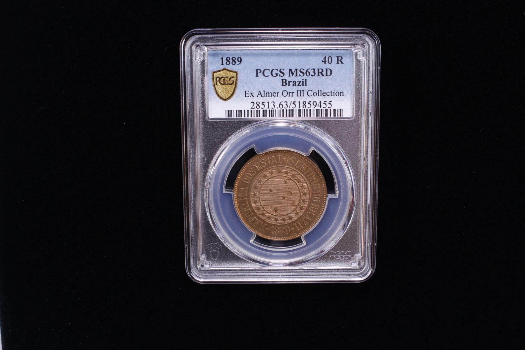 BRAZIL: Republic, AE 40 reis, 1889, KM-491, Y-2, a lovely example, PCGS graded MS63 RD, ex Almer H. Orr III Collection.