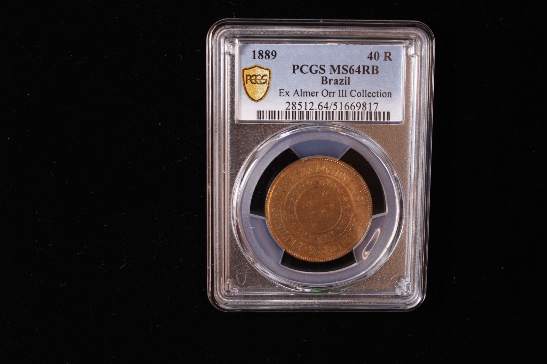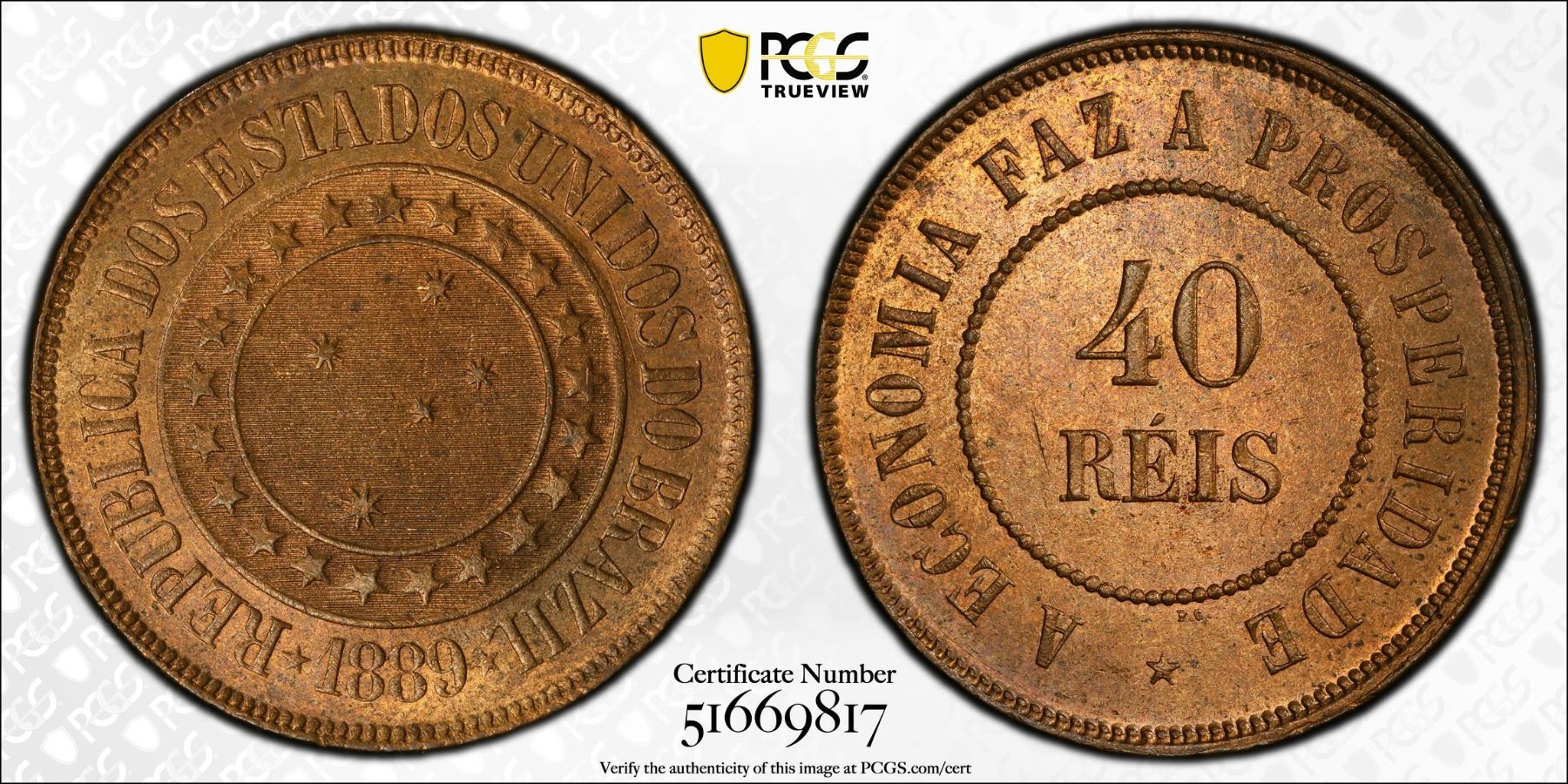 BRAZIL: Republic, AE 40 reis, 1889, KM-491, a wonderful lustrous example! PCGS graded MS64 RB, ex Almer H. Orr III Collection.