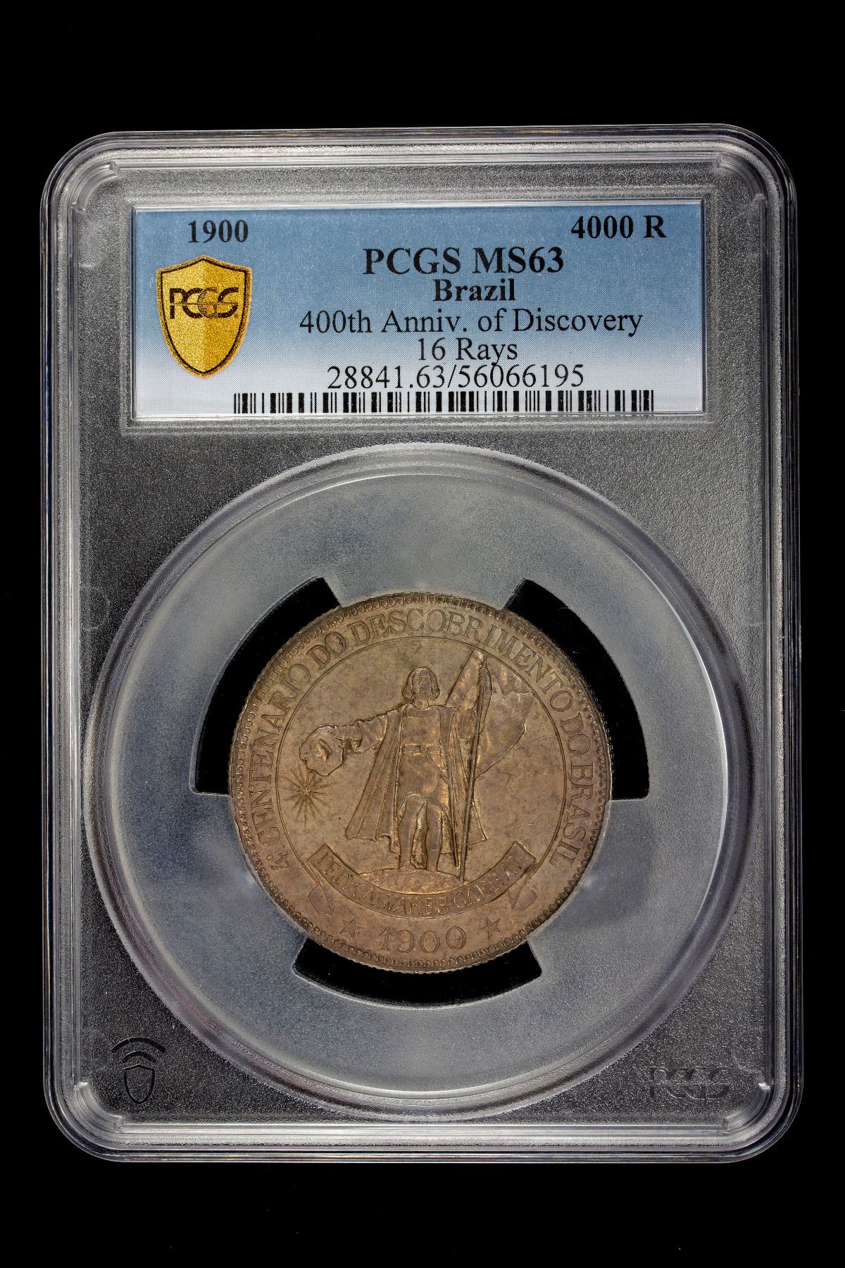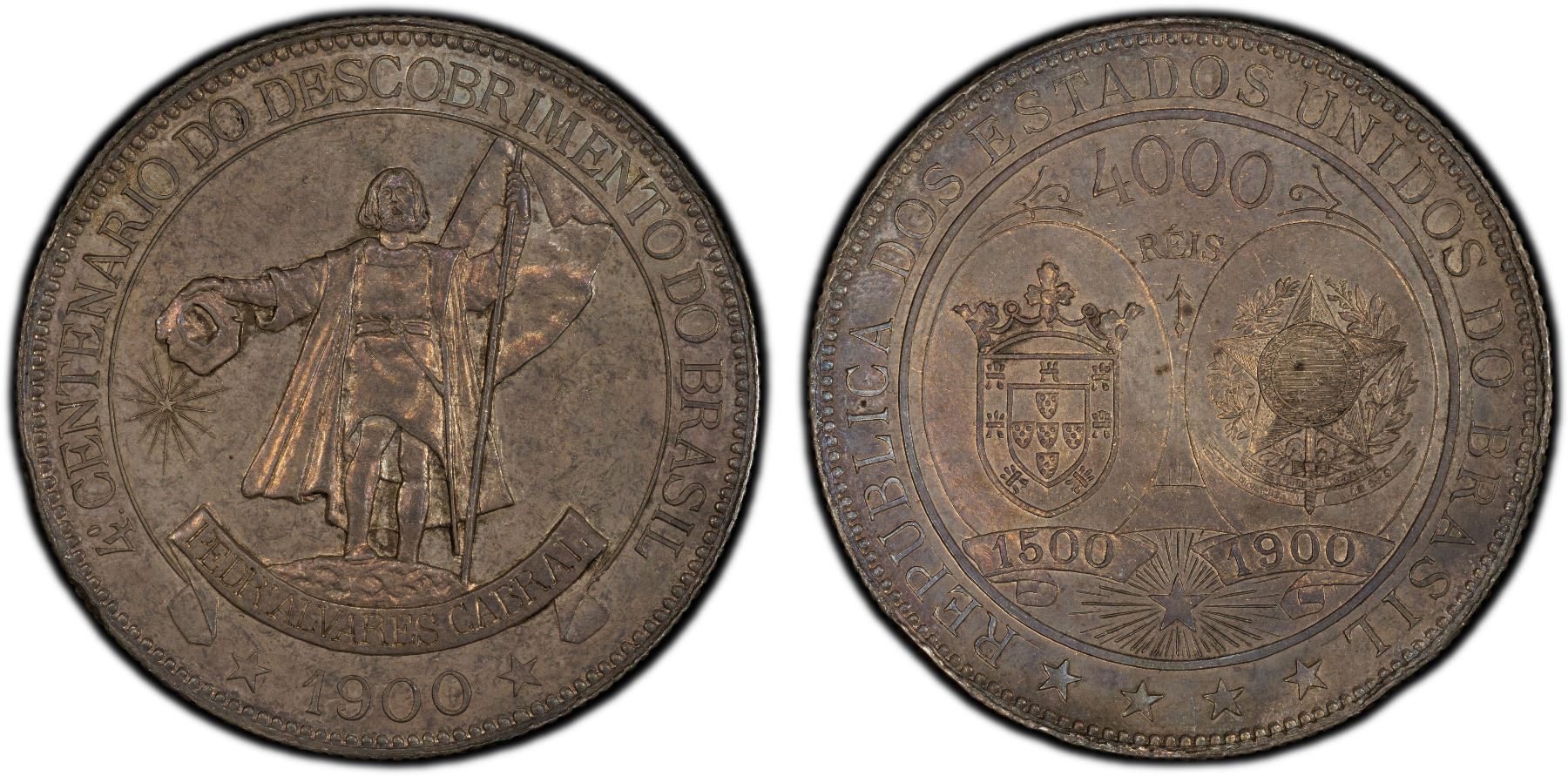BRAZIL: Republic, AR 4000 reis, 1900, KM-502.1, 400th Anniversary of the Discovery of Brazil, star with 16 rays variety, a lovely toned mint state example! PCGS graded MS63.