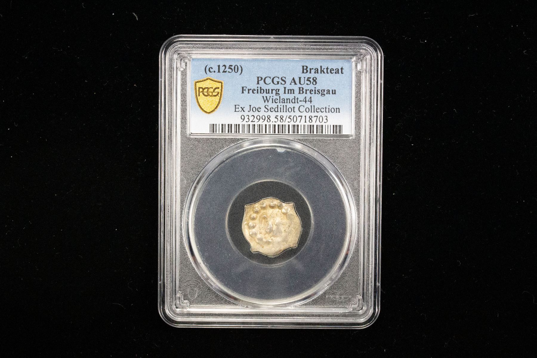 BREISGAU: Rudolph I of Hapsburg, 1240-1291, AR denier bracteate, ND (1251-53), Wielandt-44, Berger-2432, a lovely lustrous argent near mint state example, a sole PCGS top pop! PCGS graded AU58, ex Joe Sedillot Collection. Rudolph I of Habsburg built his early power base in Breisgau, a region critical to his rise from local count to King of the Romans in 1273. Through strategic landholding, alliances, and strong regional leadership, he turned a modest noble house into what would become the mighty Habsburg dynasty.