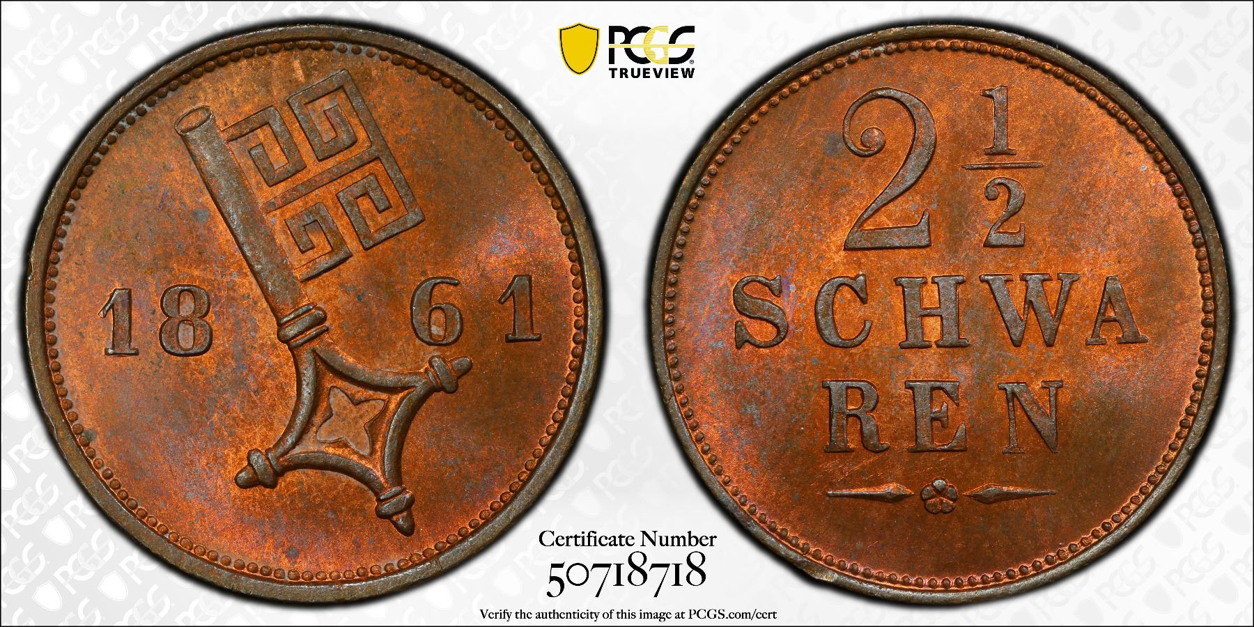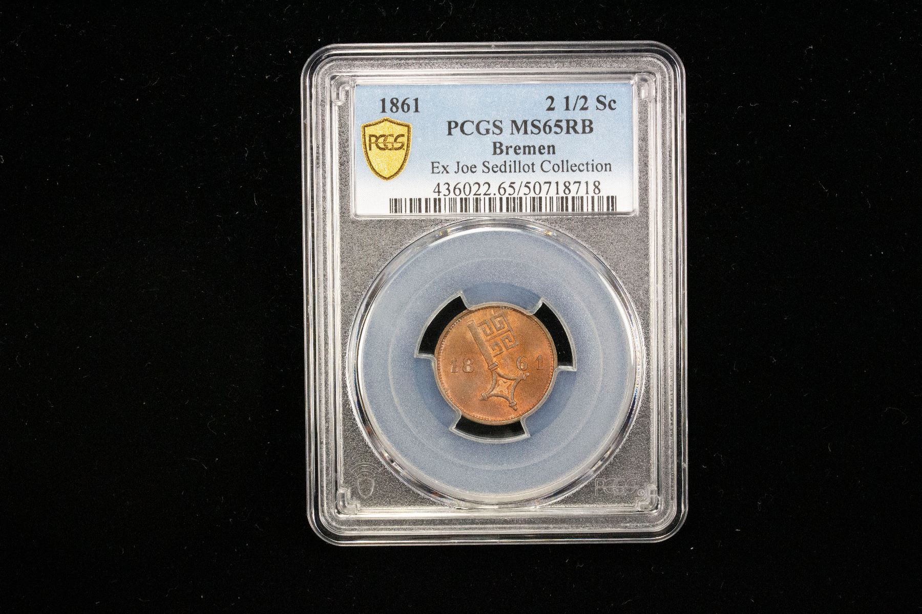 BREMEN: Free City, AE 2 1/2 schwaren, 1861, KM-234, a superb lustrous caramel red brown mint state example! PCGS graded MS65 RB, ex Joe Sedillot Collection. In 1861, Bremen was an economically booming, independent city-state and maritime powerhouse within the German Confederation. It thrived on international trade, was a key hub for emigration to America, and was rapidly modernizing its port and infrastructure while maintaining its own governance.
