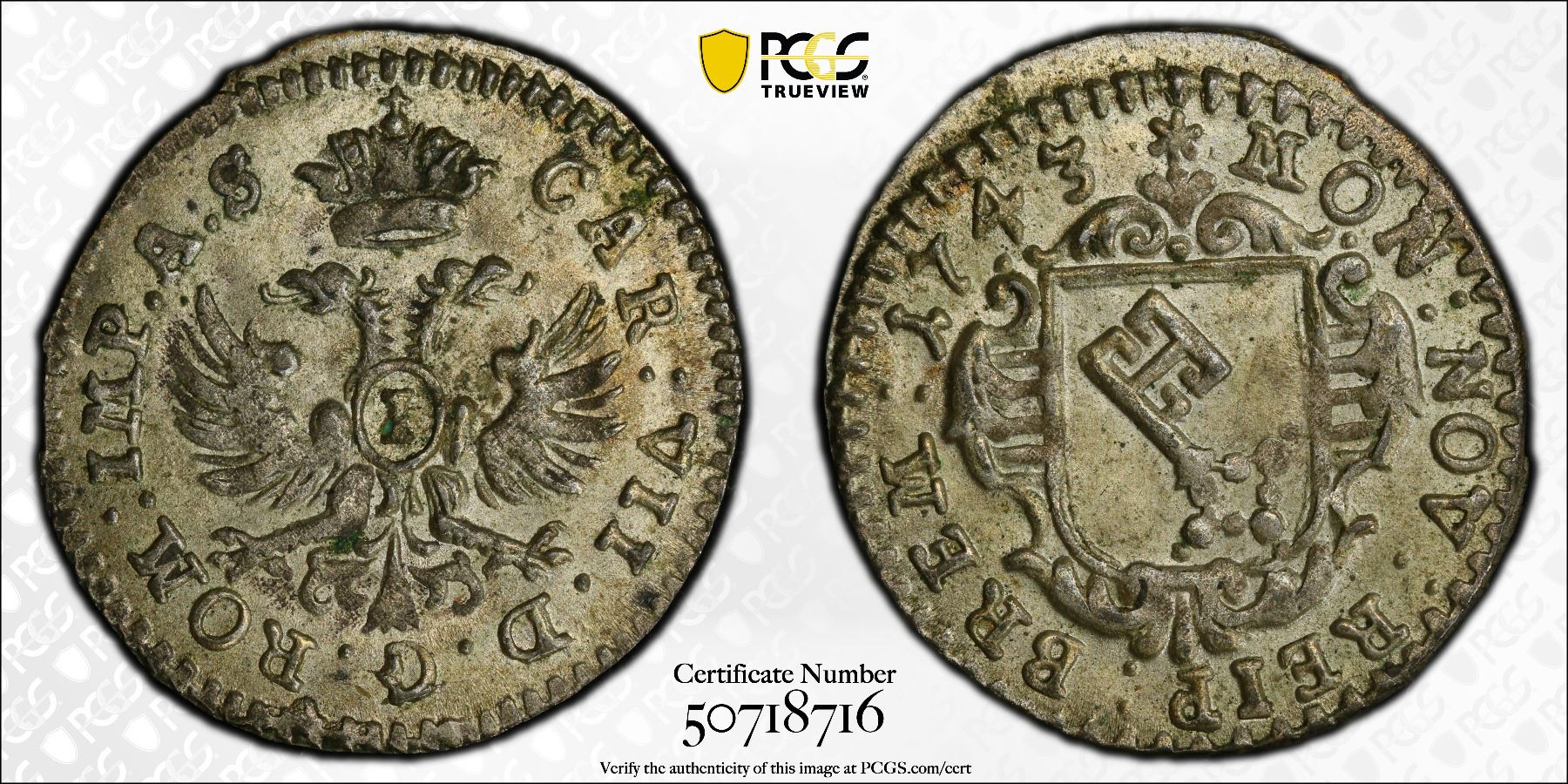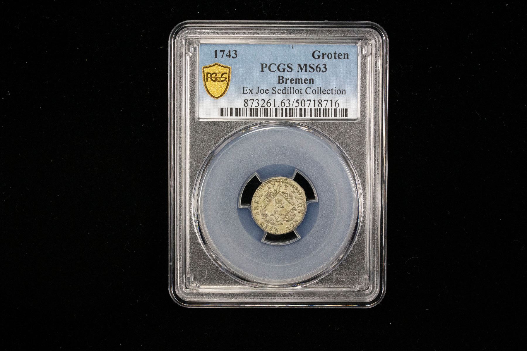 BREMEN: Free City, AR groten, 1743, KM-198, a lovely lustrous argent mint state example! PCGS graded MS63, ex Joe Sedillot Collection. In 1743, Bremen, a prosperous and independent port city within the Holy Roman Empire, continued its economic success as a member of the Hanseatic League, governed by its merchant elite. The city avoided direct involvement in the ongoing War of the Austrian Succession while maintaining its position as an important trading hub.