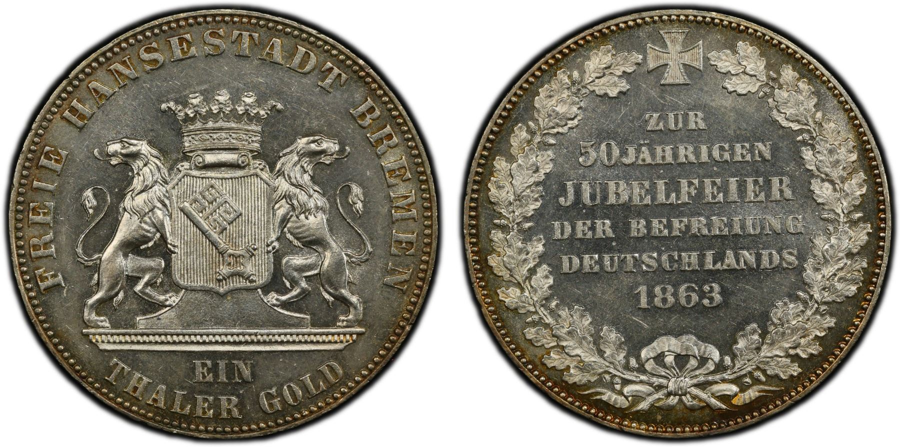BREMEN: Free City, AR thaler, 1863, KM-246, Davenport-626, commemorating the 50th Anniversary of the Liberation of Germany, a wonderful well struck reflective lightly toned mint state example! PCGS graded MS64 ProofLike, ex Joe Sedillot Collection. In 1863, Bremen was a prosperous, independent city-state focused on trade and shipping. It remained politically neutral in German affairs and stayed outside the Zollverein to protect its free trade economy.