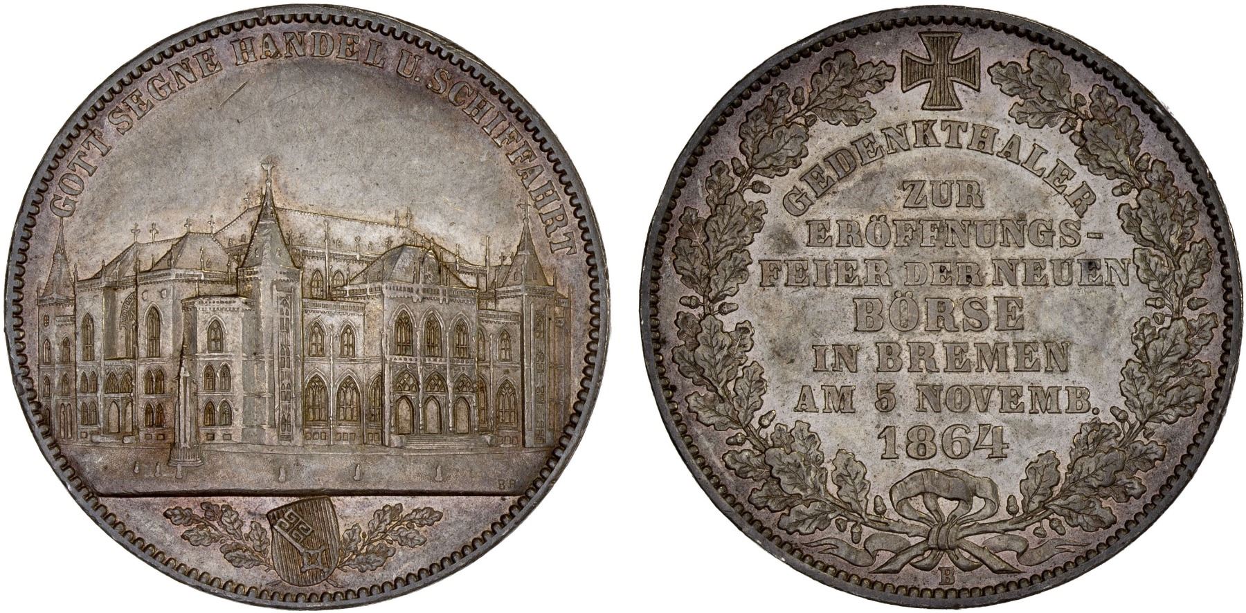 BREMEN: Free City, AR thaler, 1864-B, Bruce-XM1, Thun-125, Opening of New Business Exchange, lightly toned, mainly on obverse, mintage of only 5,000 pieces, scarce, Choice VF.