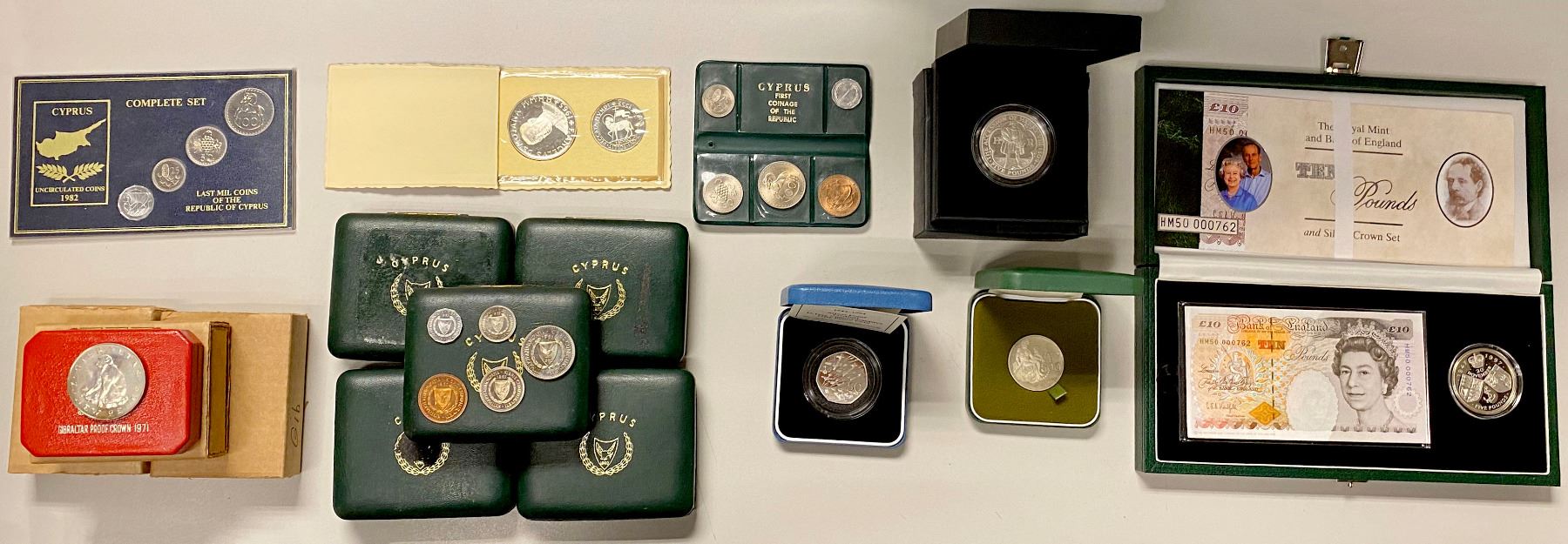 BRITISH COMMONWEALTH, ETC.: LOT of 26 singles and sets, including Cyprus proof 500 mils: 1975; Cyprus Mint Sets: 1963 and 1982; Cyprus Proof Sets: 1963 (5 sets); Gibraltar proof crown: 1971 (3); Great Britain proof piedfort silver 50 pence: 1994; Great Britain proof 5 pounds: 2009 (Henry VIII); Great Britain BU set: 1947 (in case marked 1947 Specimen Coin Set); Great Britain 5 pounds (proof coin) and 10 pound note (CU): (1997); Great Britain AE medal: 1960 British Exhibition BU; Malta Mint Set: 1972 (2); and Malta Proof Set: 1965 (2-pc), 1972, 1976 (2 sets), 1977 (2 sets), and 1986; retail value $850, lot of 26 items.