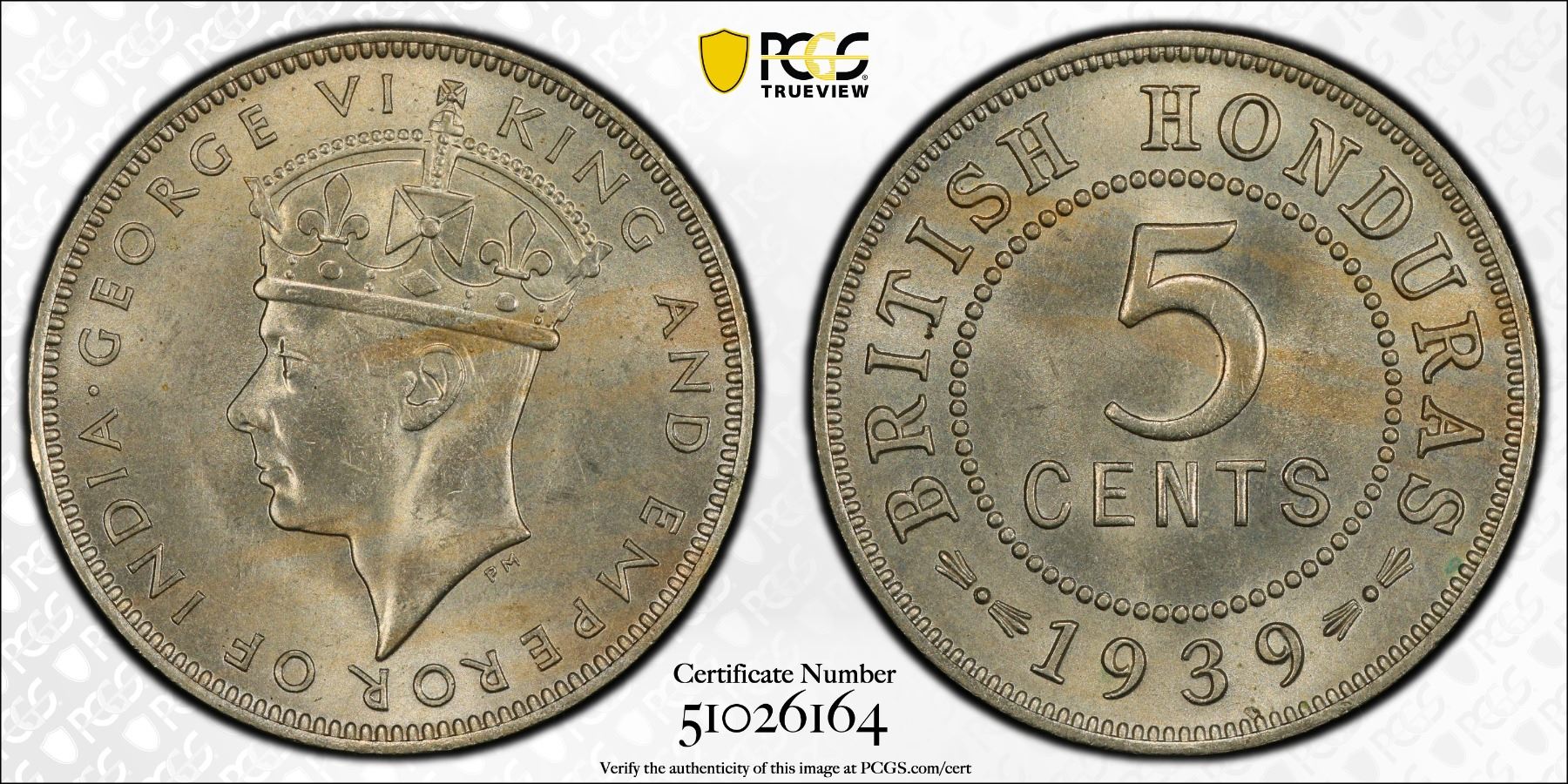 BRITISH HONDURAS: George VI, 1936-1952, 5 cents, 1939, KM-22, a superb example, PCGS graded MS65, ex Almer H. Orr III Collection.