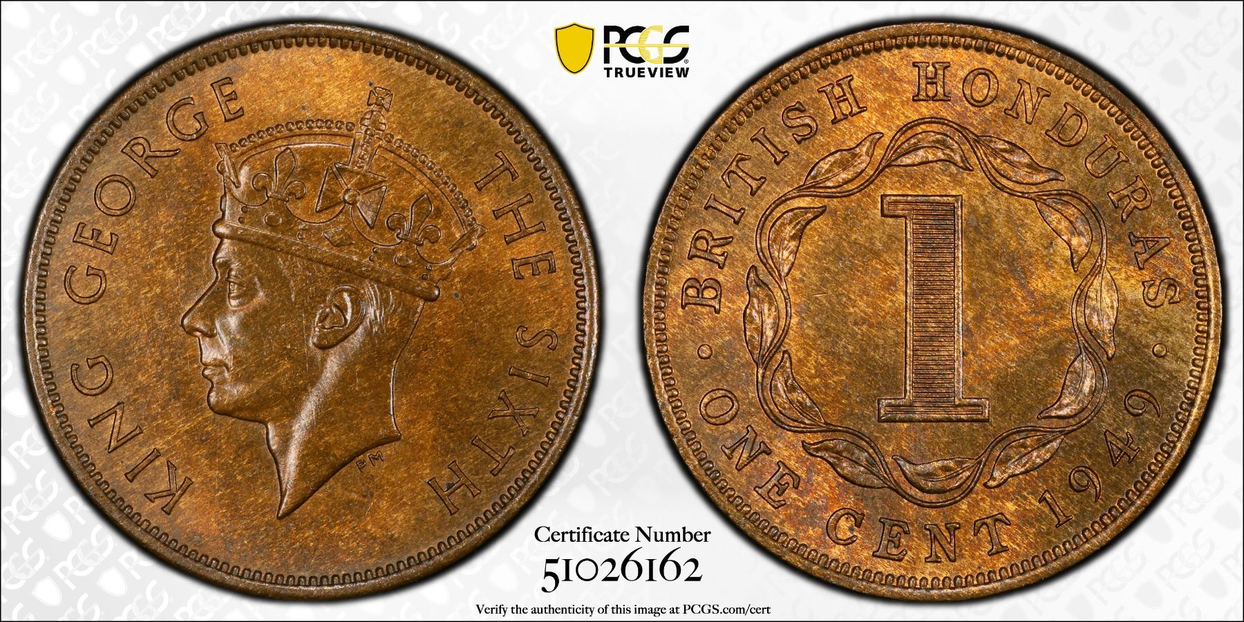 BRITISH HONDURAS: George VI, 1936-1952, AE cent, 1949, KM-24, a wonderful example, PCGS graded MS64 RB, ex Almer H. Orr III Collection.