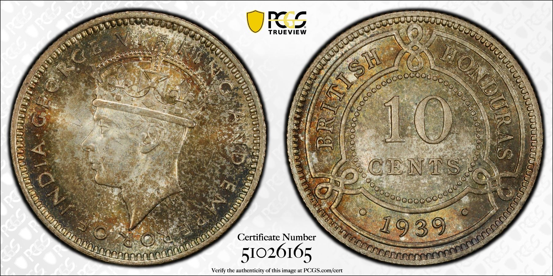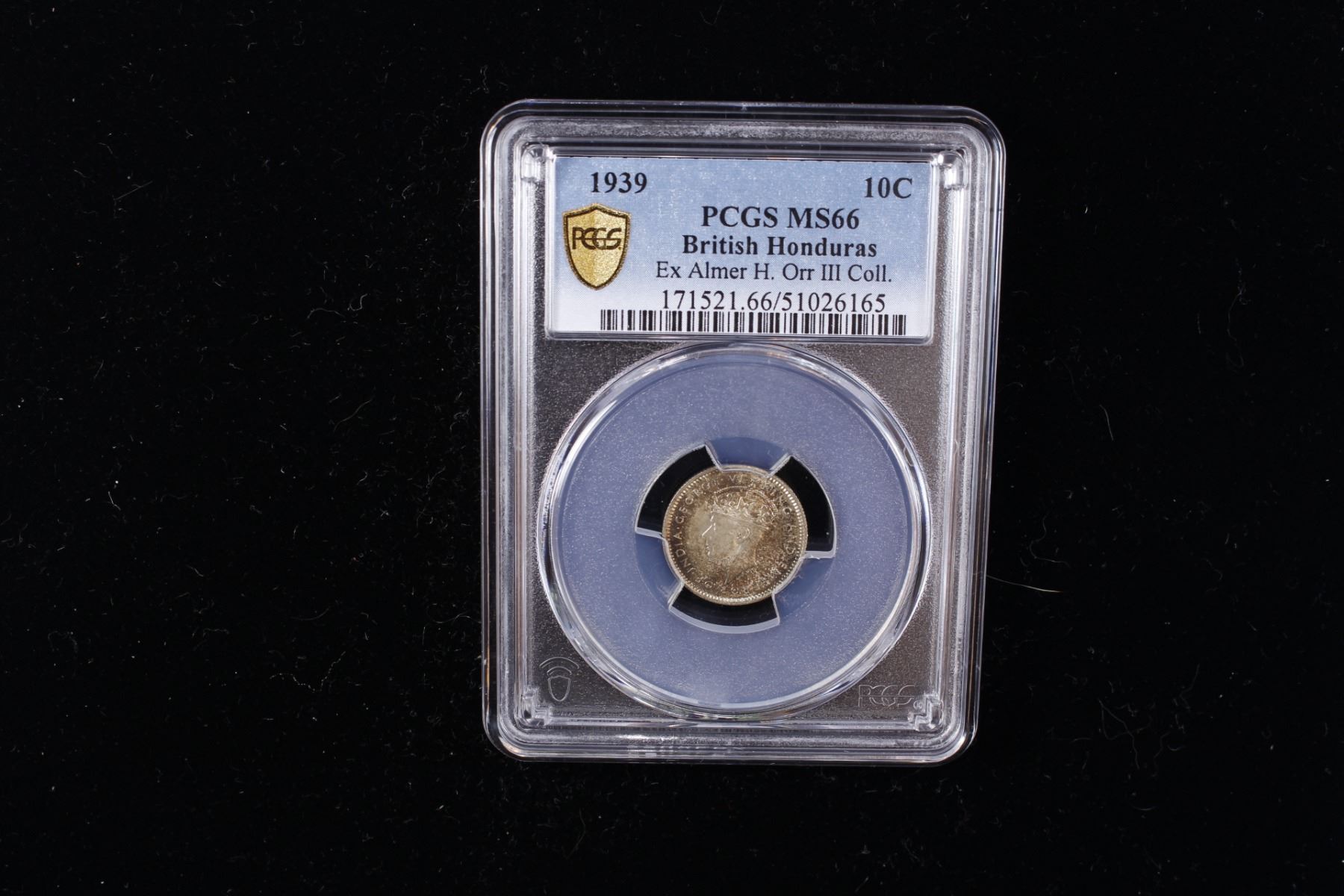 BRITISH HONDURAS: George VI, 1936-1952, AR 10 cents, 1939, KM-23, a fantastic example, nicely toned, PCGS graded MS66, ex Almer H. Orr III Collection. Tied with only one other example for highest graded (Top Pop) at PCGS.
