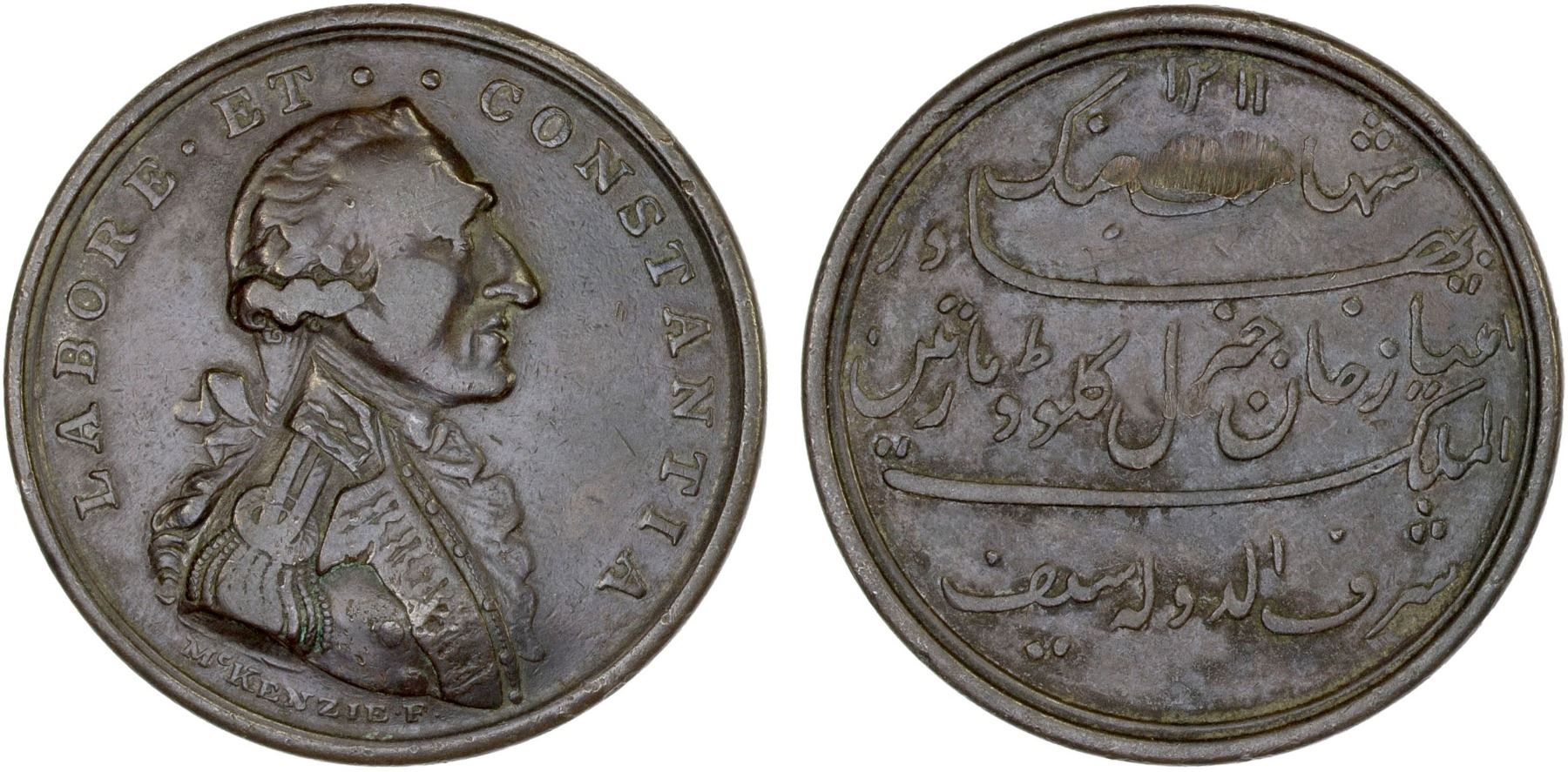BRITISH INDIA: AE medal (13.18g), AH1211 (1796/97), Pud-796.2, East India Company era, 34mm; bronze medal of Claude Martin by A. McKenzie, Type II, uniformed bust right with LABORE ET. CONSTANTIA around // three lines of Urdu text with hijri date at top, small gouge on reverse (to eliminate part of the Urdu legend?), VF, R.