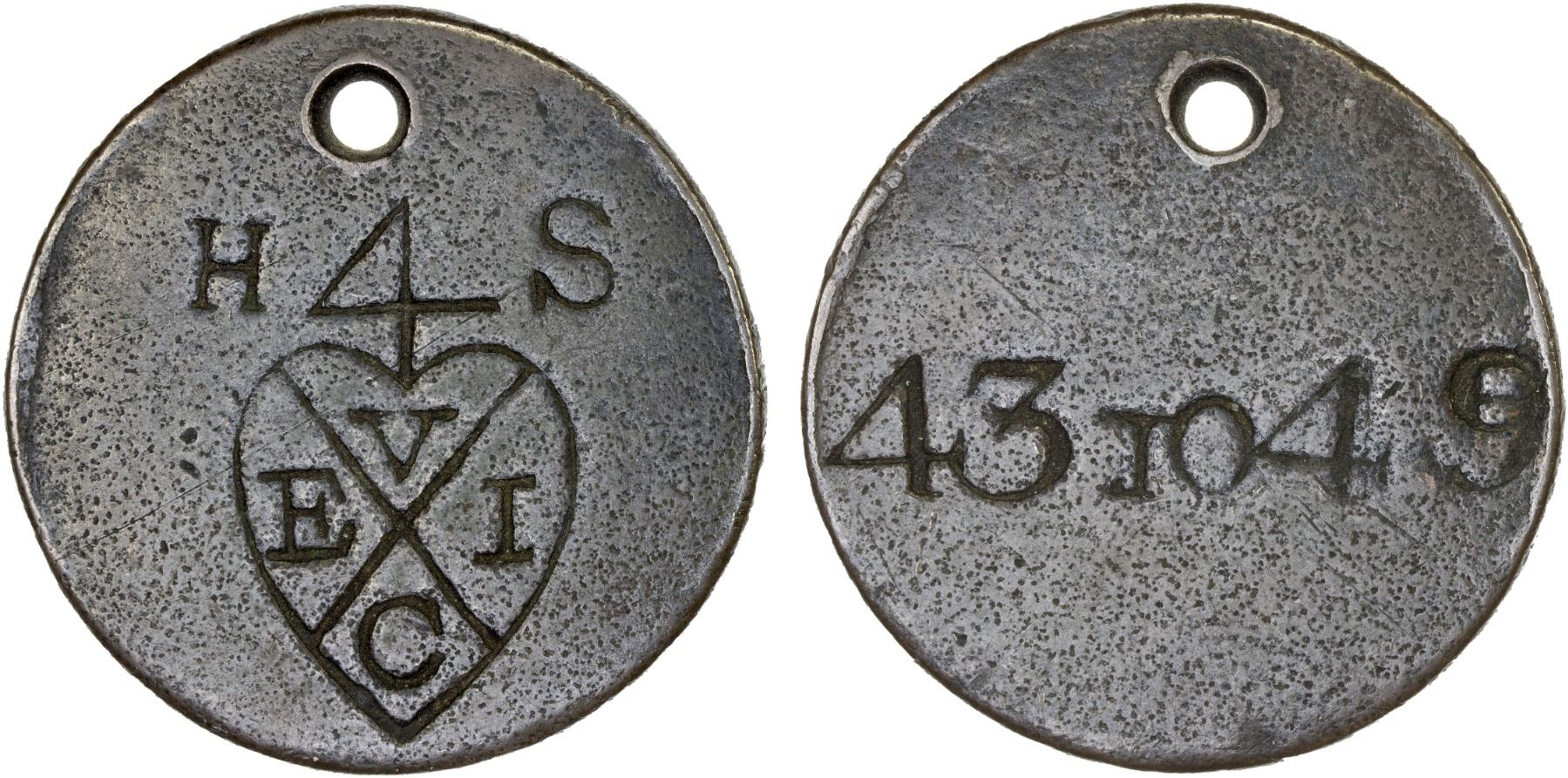 BRITISH INDIA: East India Company, ca. 1790s, AE token (21.66g), 36.5mm; workman's check or tally: includes EIC balemark and letters H S at the top, stamped "43 TO 49" on the reverse, pierced for suspension; with Pridmore's original ticket, RRR, ex Major F. Pridmore Collection; ex Baldwin / Glendining Auction, October 19, 1982, Lot 704 (part).