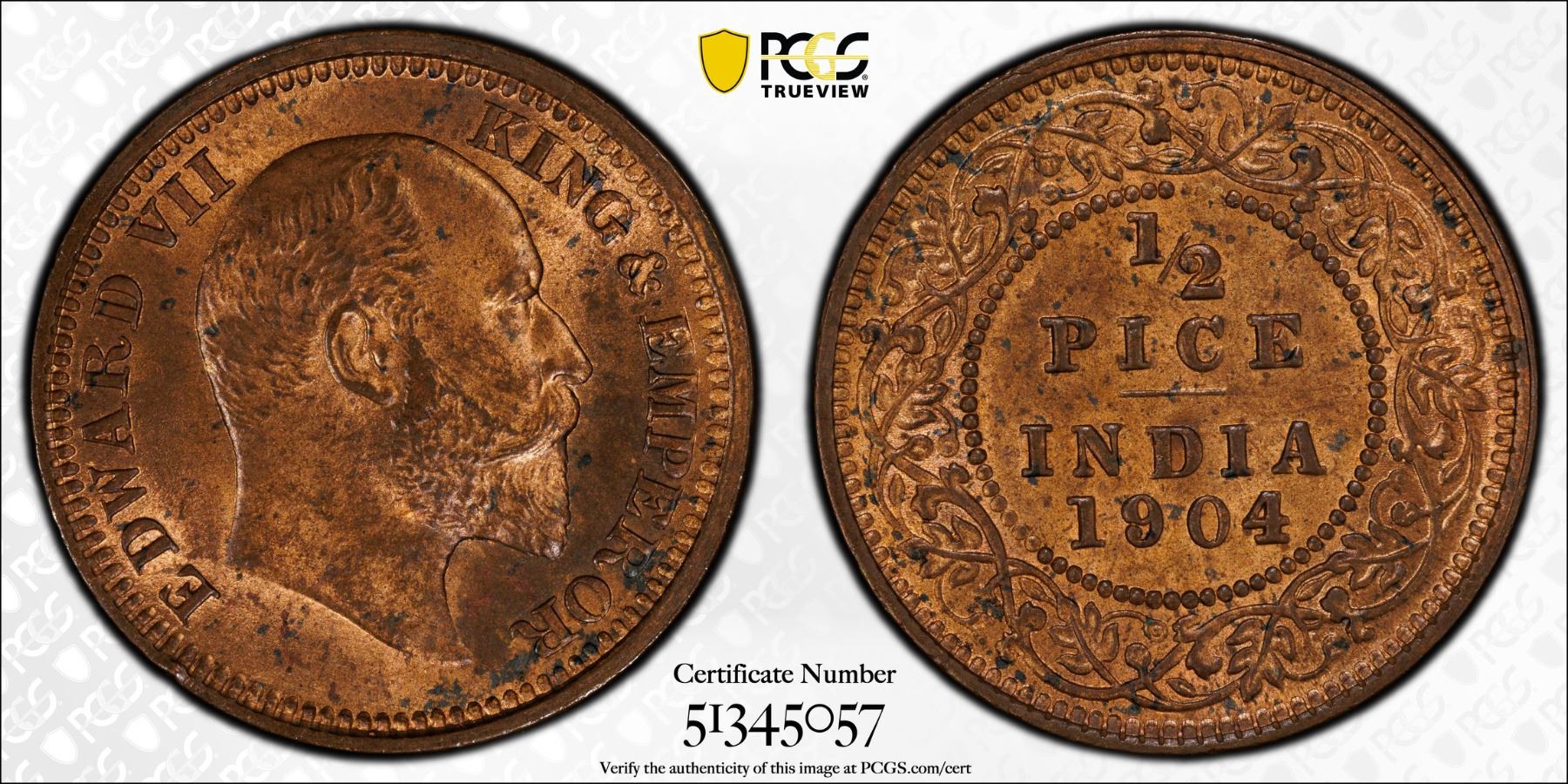 BRITISH INDIA: Edward VII, 1901-1910, AE 1/2 pice, 1904(c), PCGS MS64 RB