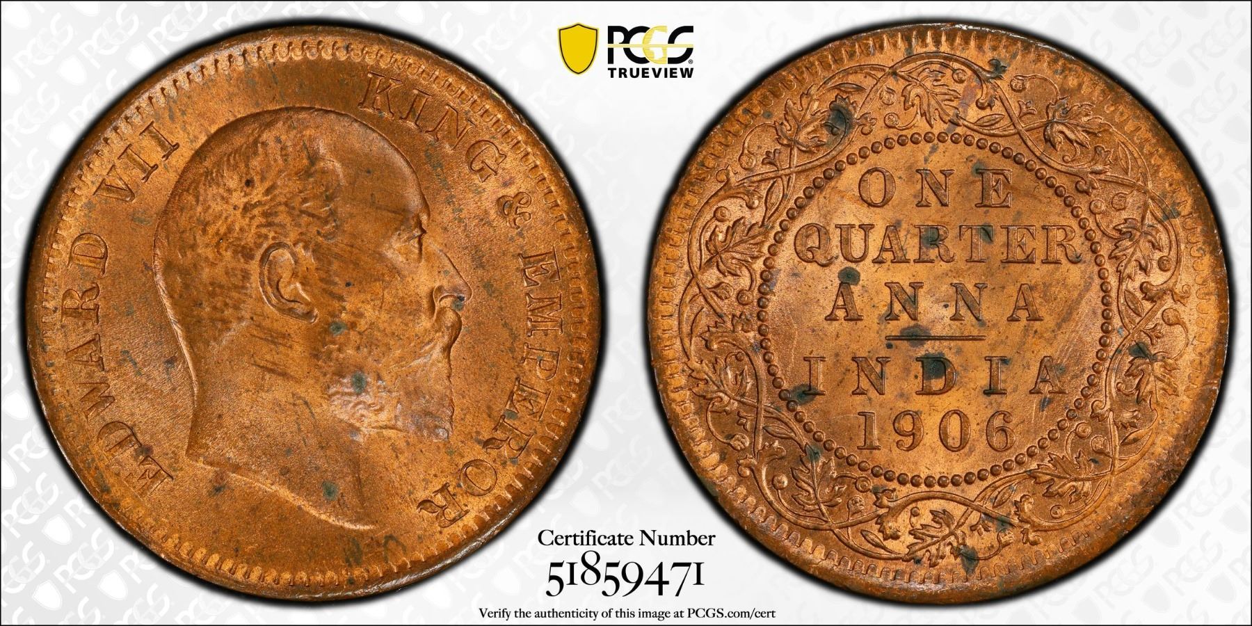 BRITISH INDIA: Edward VII, 1901-1910, AE 1/4 anna, 1906(c), PCGS MS63 RB