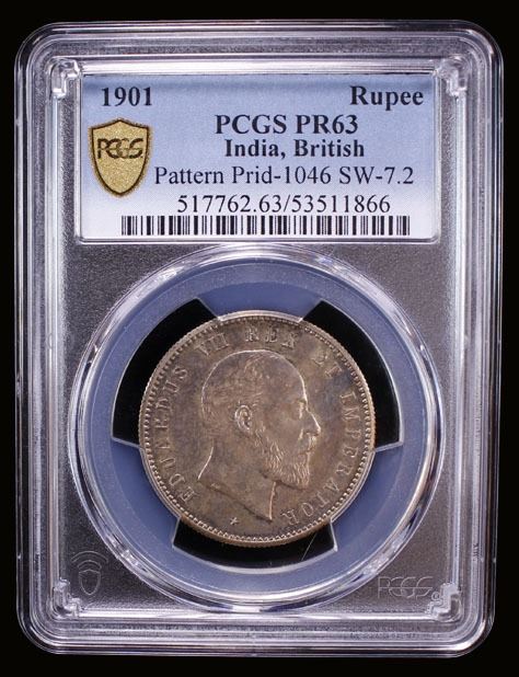 BRITISH INDIA: Edward VII, 1901-1910, AR rupee, 1901(c), KM-Pn67, S&W-7.2, Prid-1046, pattern by F.K. Wezel; EDUARDUS VII REX ET IMPERATOR around bare head Edward VII wright with star below // ONE RUPEE / INDIA 1901 in outer legend, crown above ornate circle with lion walking left and E.R.I. above, decorative motifs at the bottom, Bombay mint proof restrike, a lovely lustrous example! PCGS graded Proof 63.