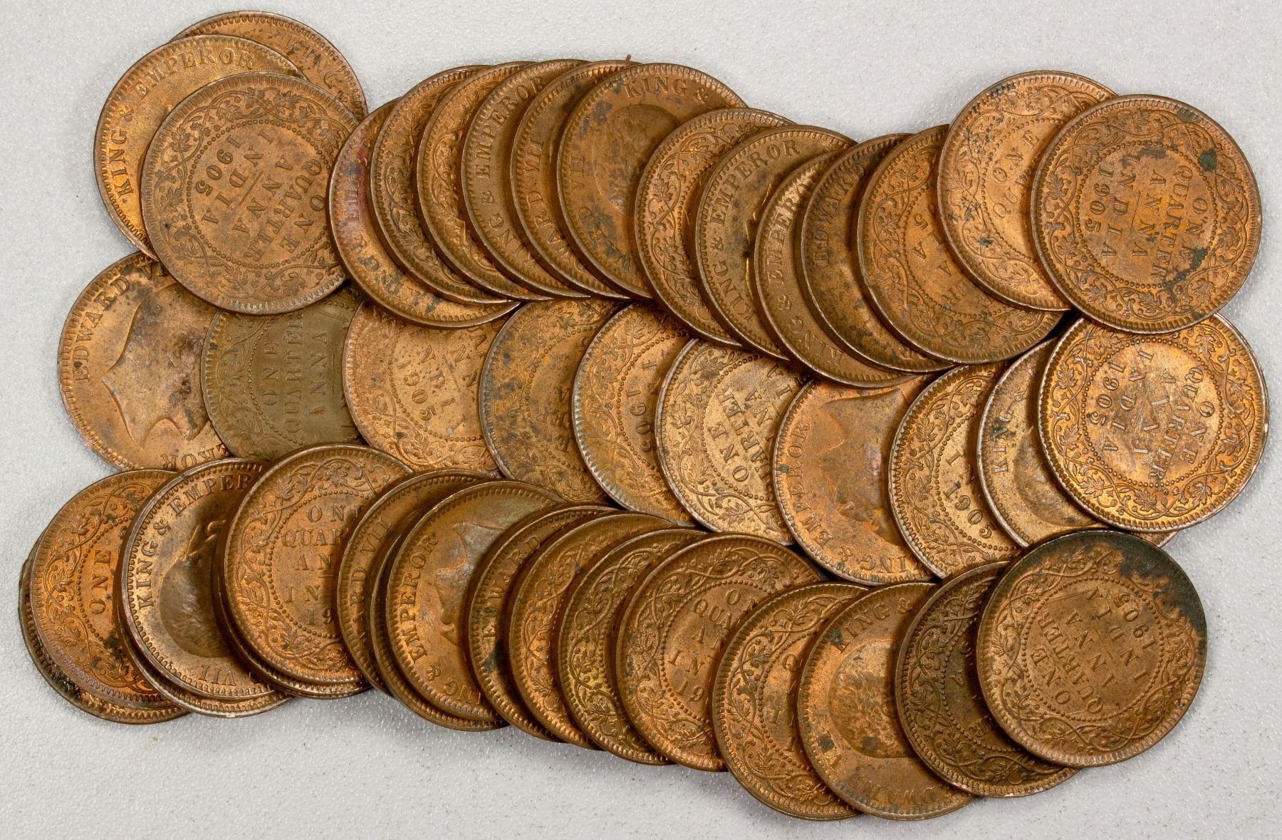 BRITISH INDIA: Edward VII, 1901-1910, LOT of 44 coins, group of AE ¼ anna, 1905(c), KM-501, S&W-7.165, all about mint state with some red luster, a few with carbon spots, all the same date and mint, retail value $880, lot of 44 coins .