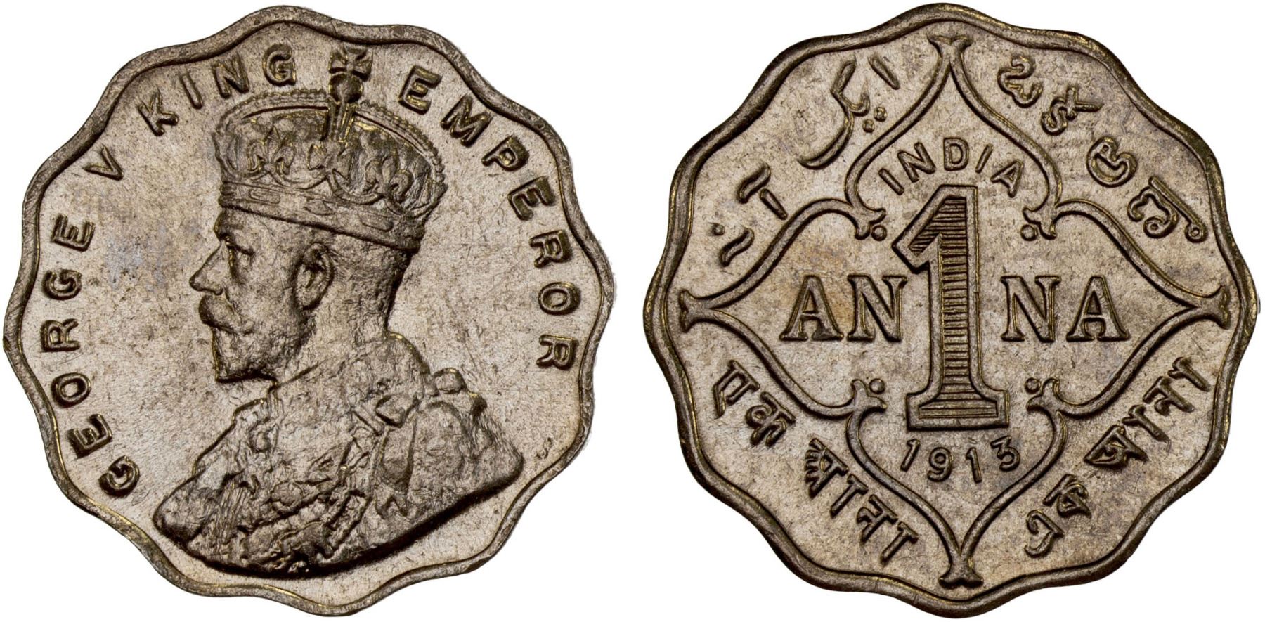 BRITISH INDIA: George V, 1910-1936, 1 anna, 1913(c), Unc