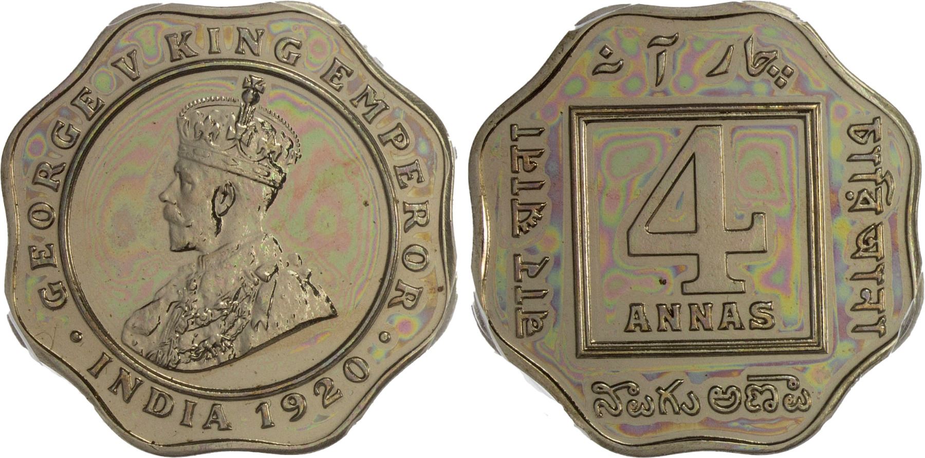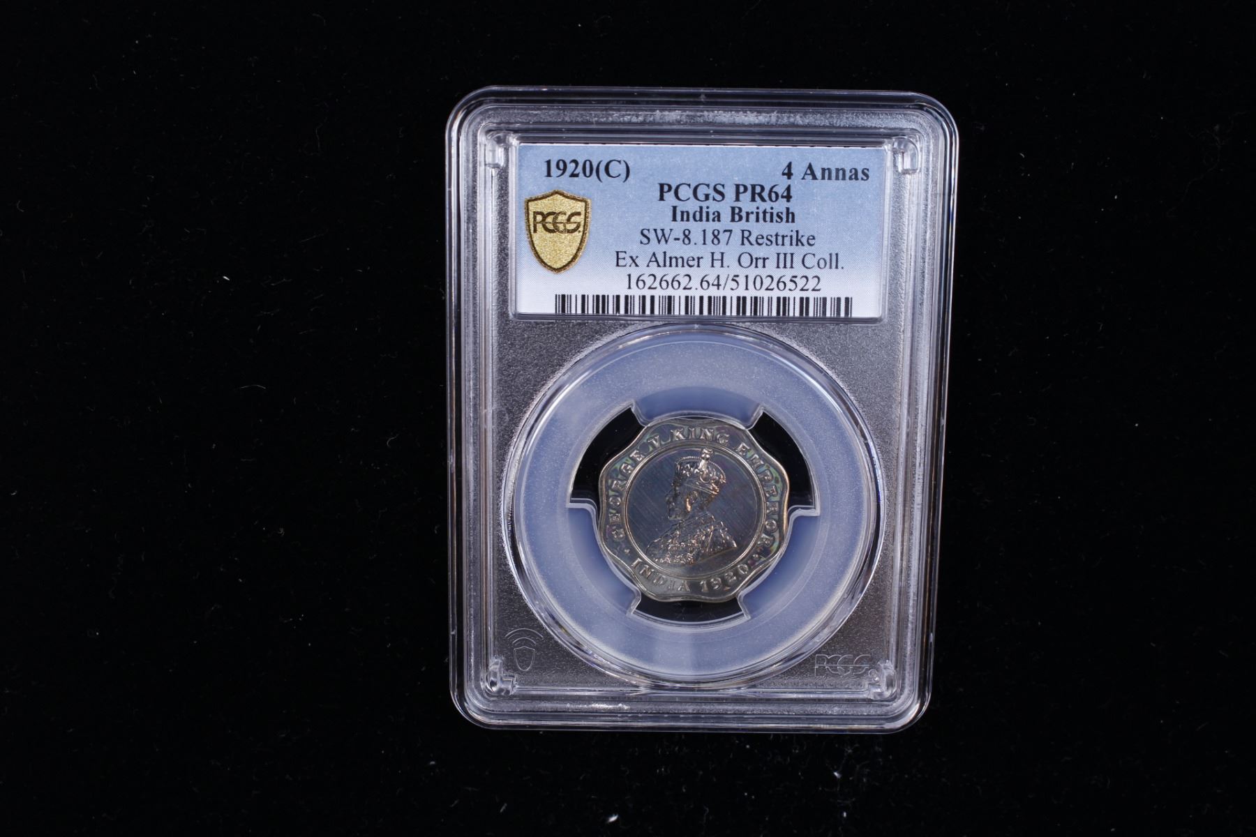 BRITISH INDIA: George V, 1910-1936, 4 annas, 1920(c), KM-519, S&W-8.187, Bombay Mint proof restrike, PCGS graded Proof 64, ex Almer H. Orr III Collection.