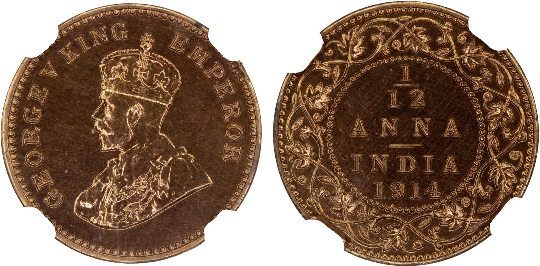 BRITISH INDIA: George V, 1910-1936, AE 1/12 anna, 1914(c), NGC MS63 PL RD