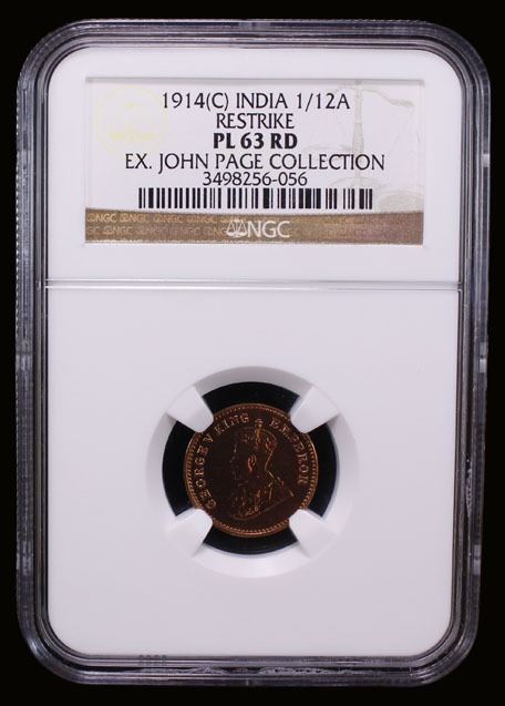 BRITISH INDIA: George V, 1910-1936, AE 1/12 anna, 1914(c), KM-509, Calcutta Mint later proof restrike, NGC graded MS63 PL RD, ex SARC Auction 15 Lot 1489, ex John Page Collection, ex The 1914 Collection.