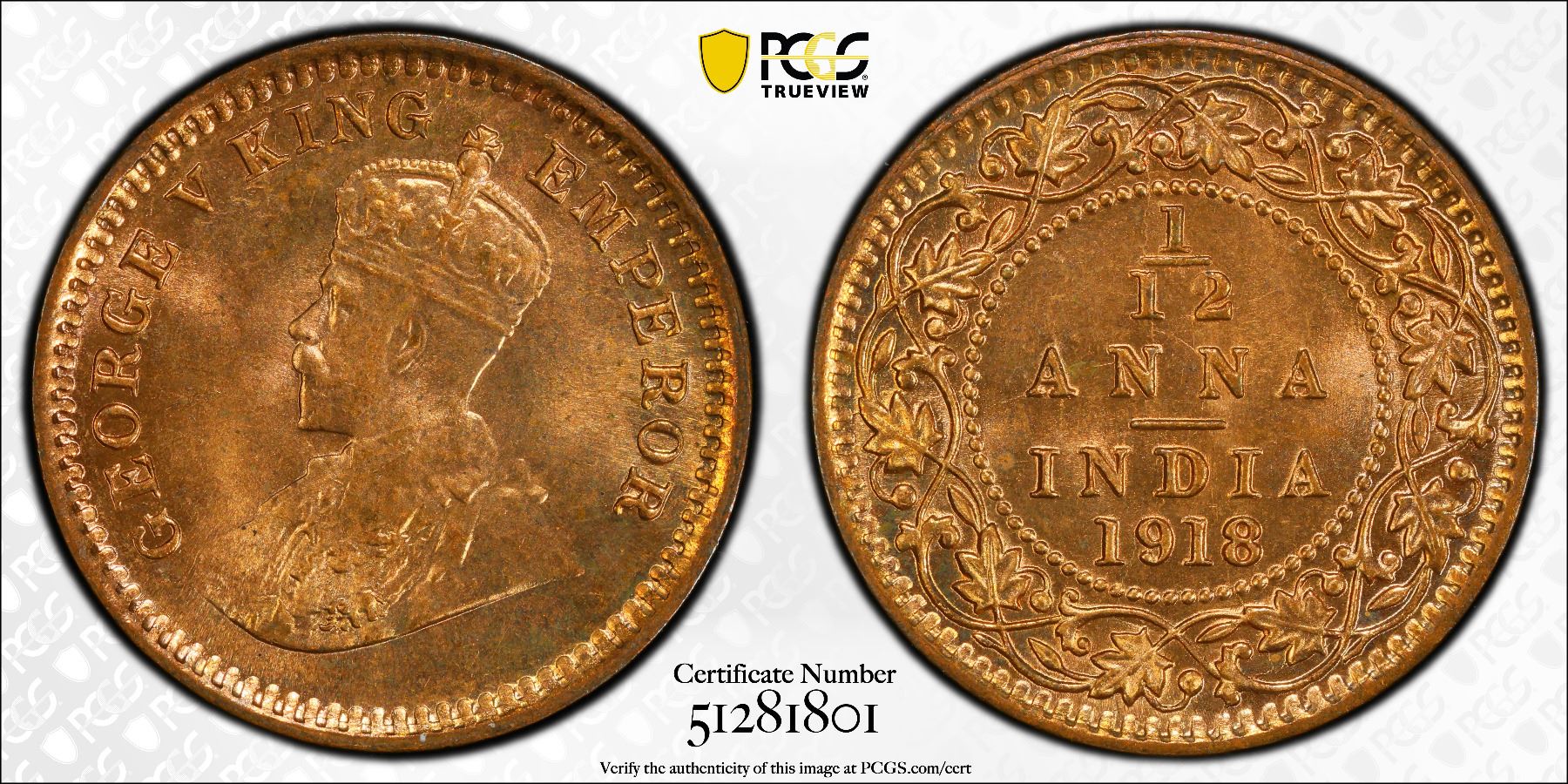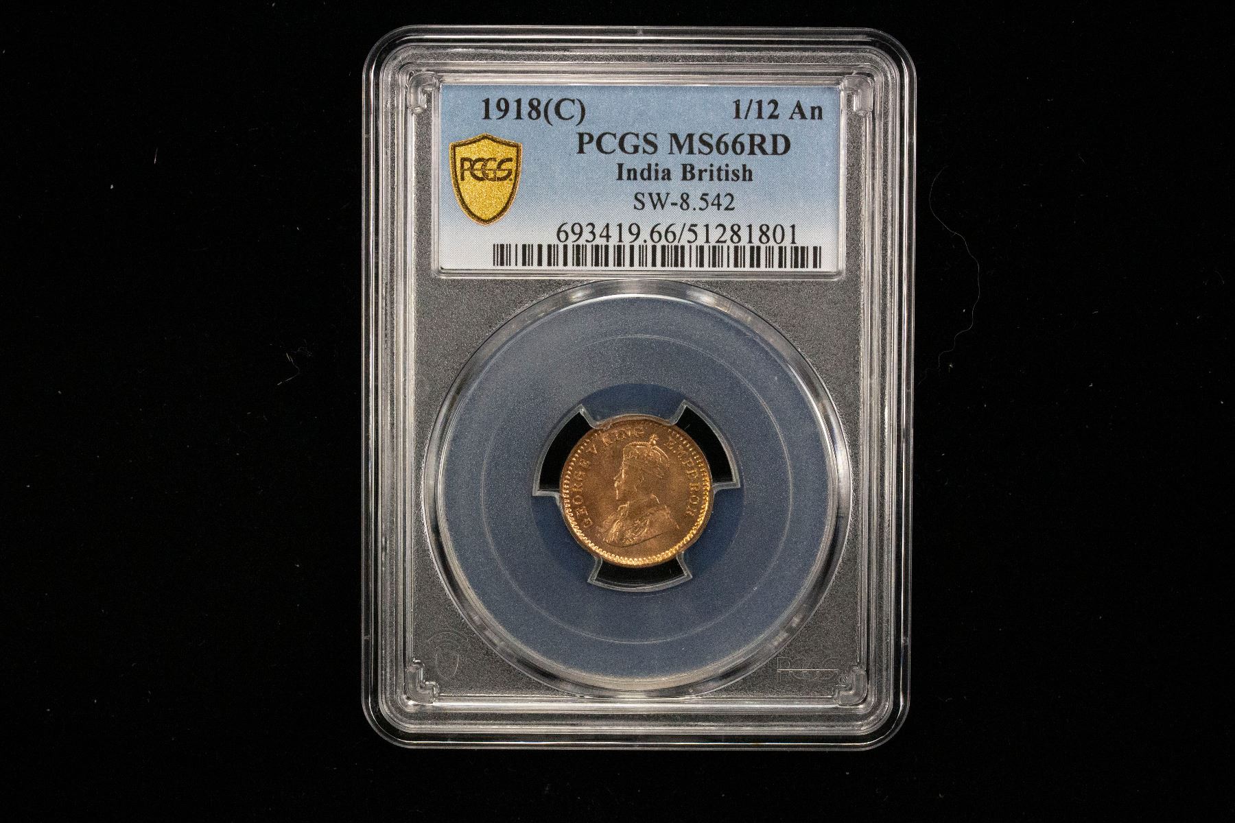 BRITISH INDIA: George V, 1910-1936, AE 1/12 anna, 1918(c), KM-509, S&W-8.542, a fantastic red lustrous mint state example! PCGS graded MS66 RD.