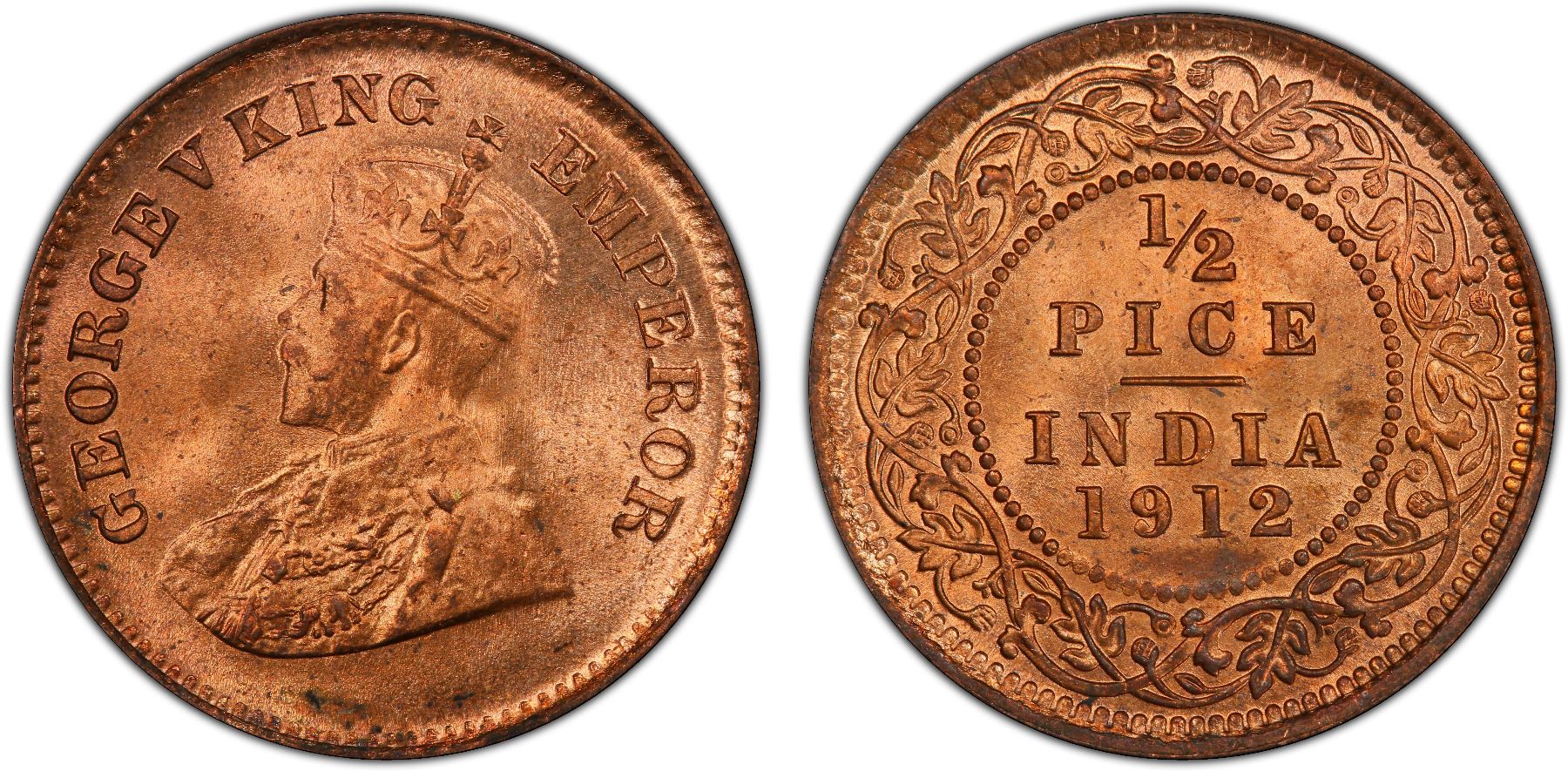 BRITISH INDIA: George V, 1910-1936, AE 1/2 pice, 1912(c), KM-510, S&W-8.390, a superb red lustrous example! PCGS graded MS65 RD.