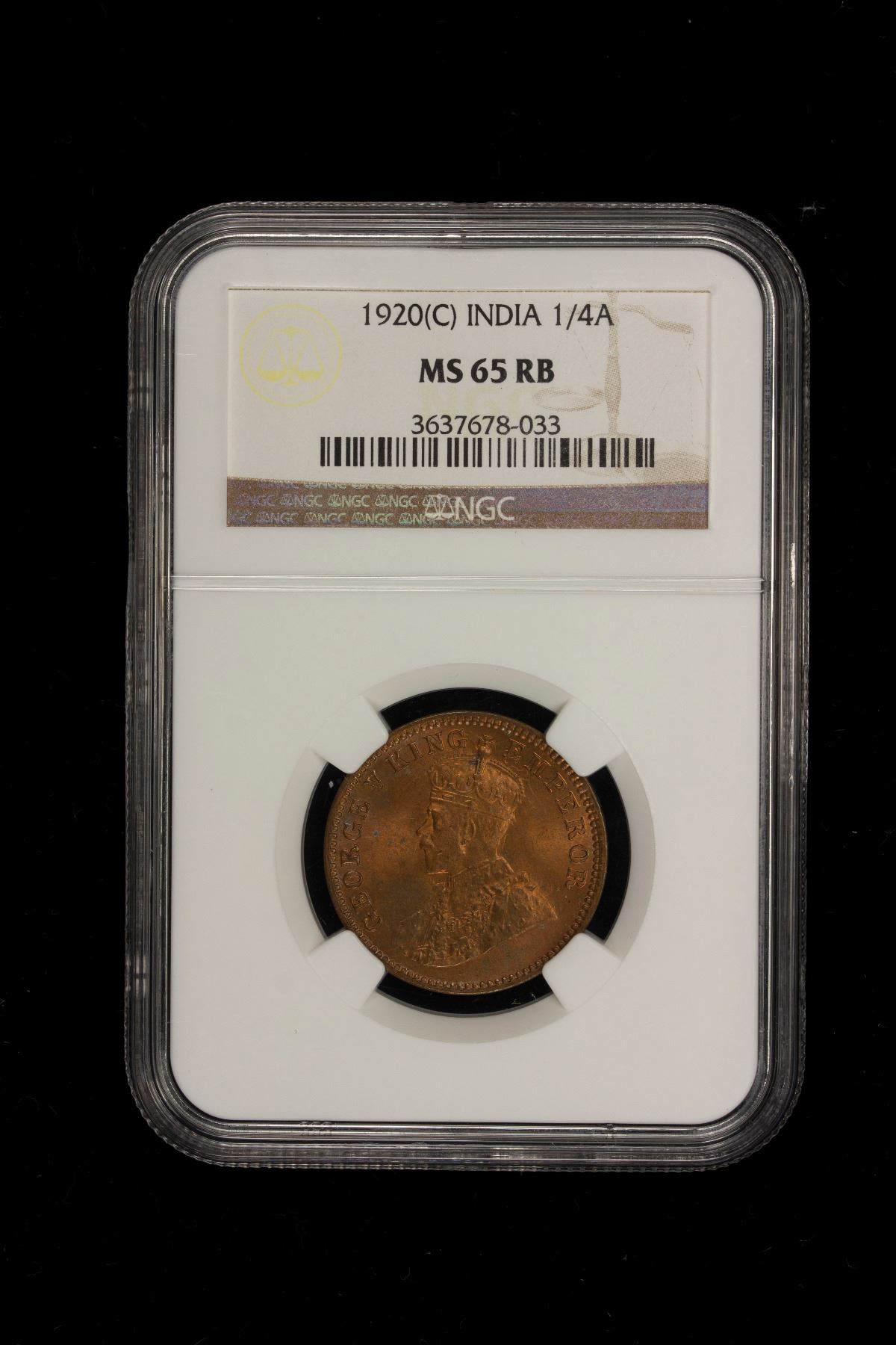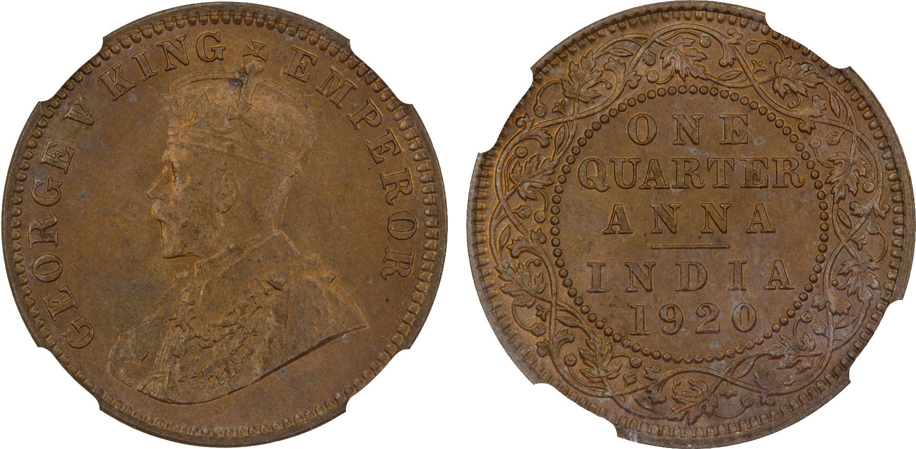 BRITISH INDIA: George V, 1910-1936, AE 1/4 anna, 1920(c), NGC MS65 RB