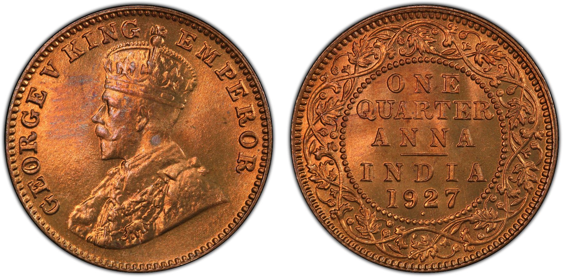 BRITISH INDIA: George V, 1910-1936, AE ¼ anna, 1927(b), KM-512, S&W-8.365, a wonderful full red lustrous example! PCGS graded MS66 RD.
