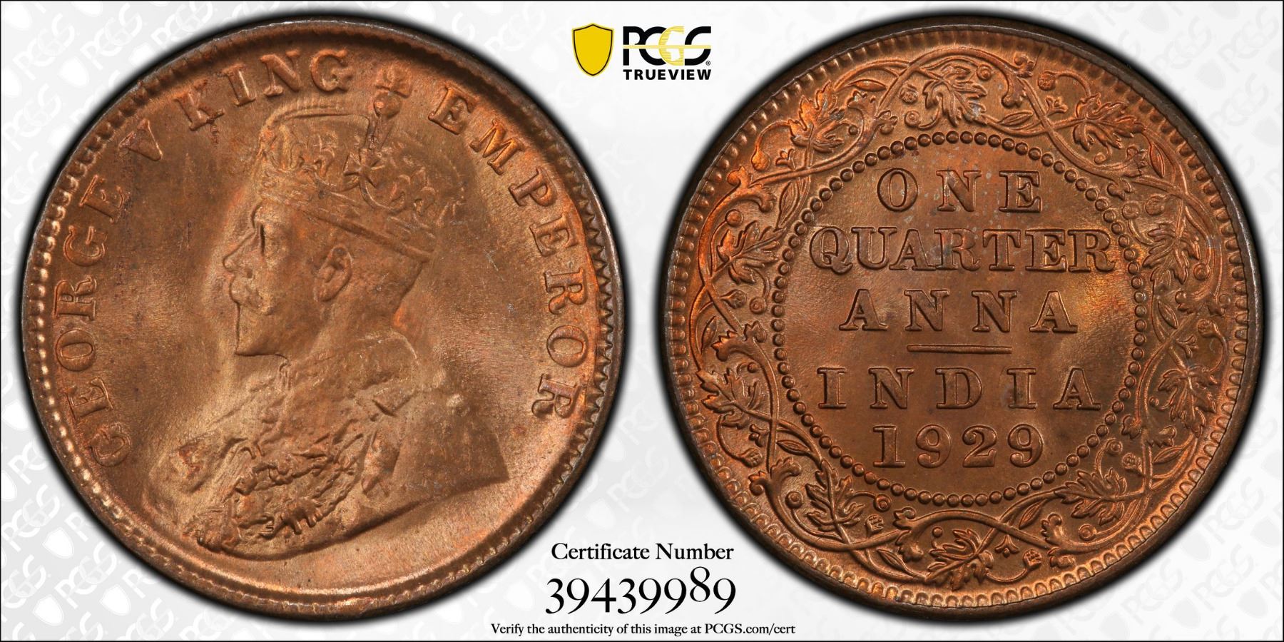 BRITISH INDIA: George V, 1910-1936, AE ¼ anna, 1929(c), PCGS MS66 RB