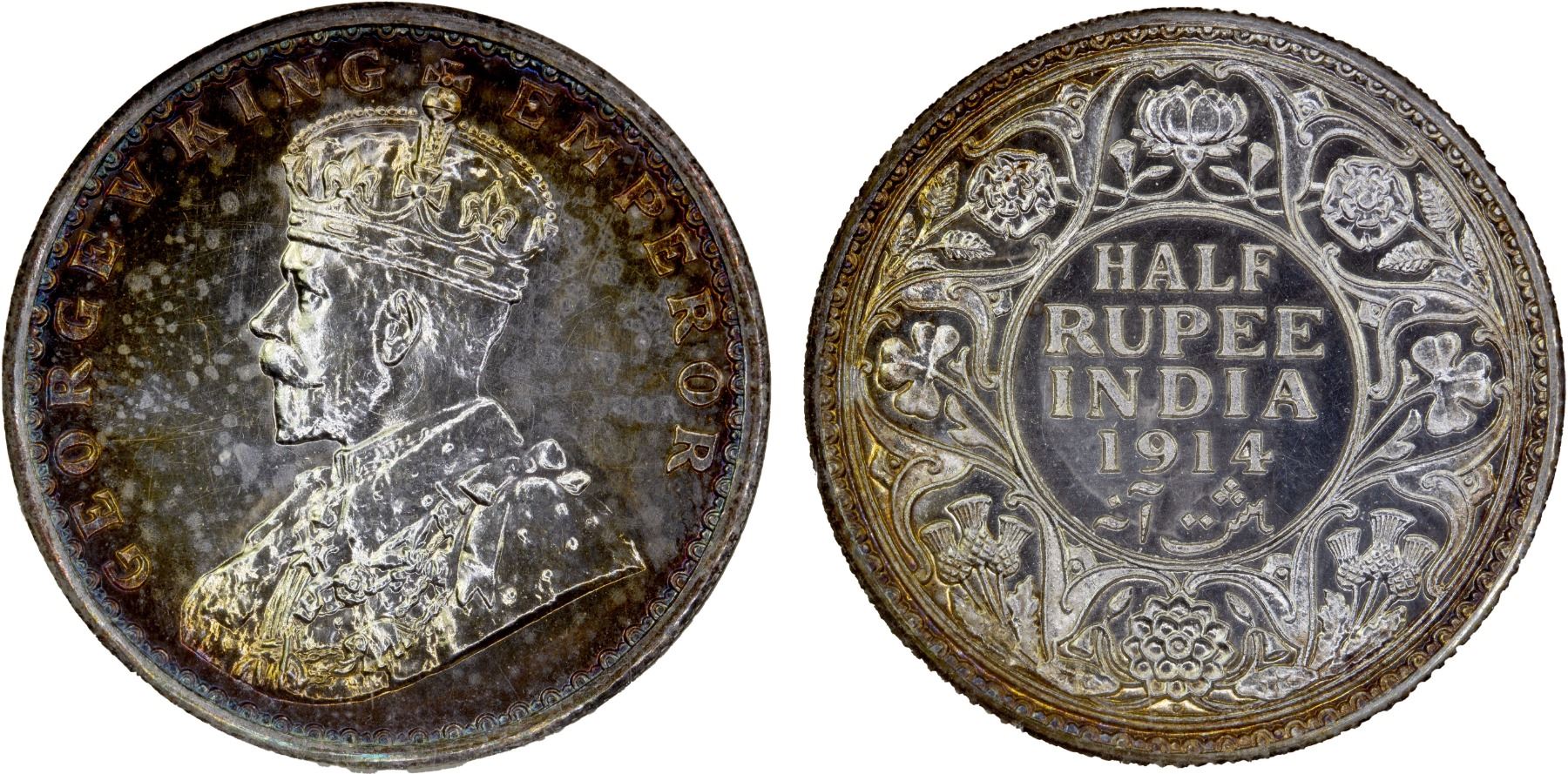BRITISH INDIA: George V, 1910-1936, AR 1/2 rupee, 1914(b), KM-522, S&W-8.74, Bombay Mint proof, beautiful multicolored album toning, NGC graded Proof 64, ex The 1914 Collection. Finest graded by both NGC and PCGS.