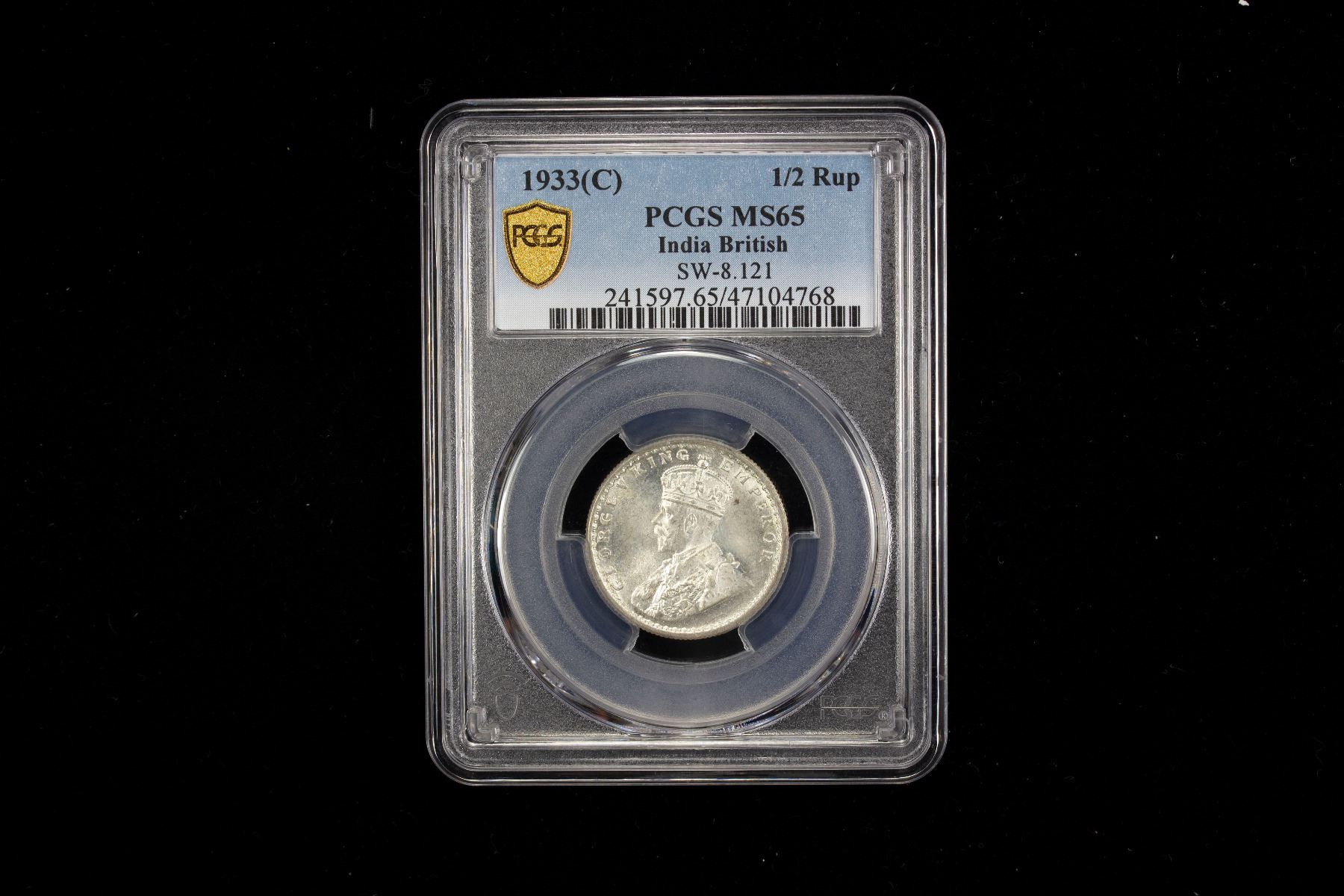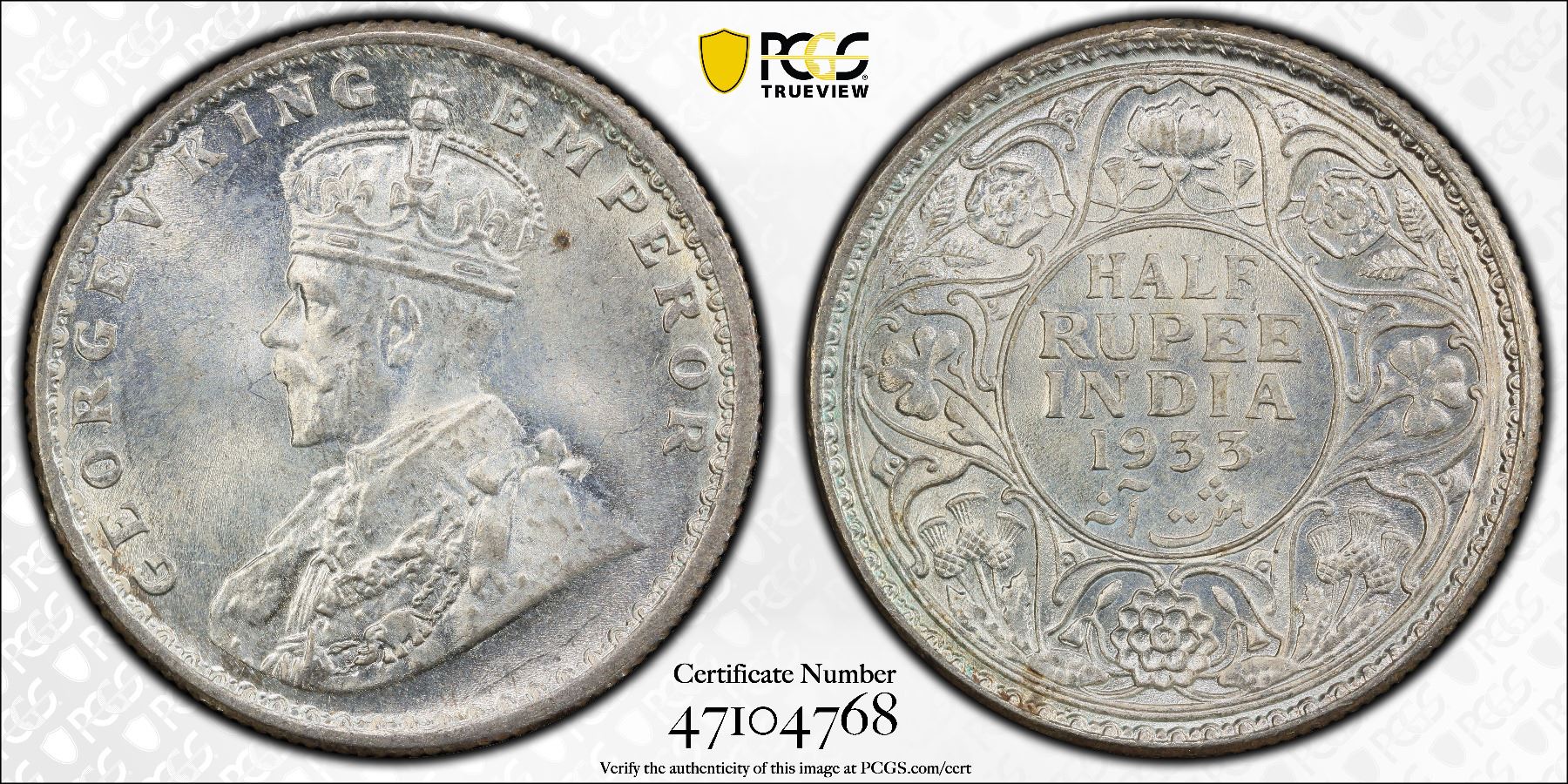 BRITISH INDIA: George V, 1910-1936, AR 1/2 rupee, 1933(c), PCGS MS65