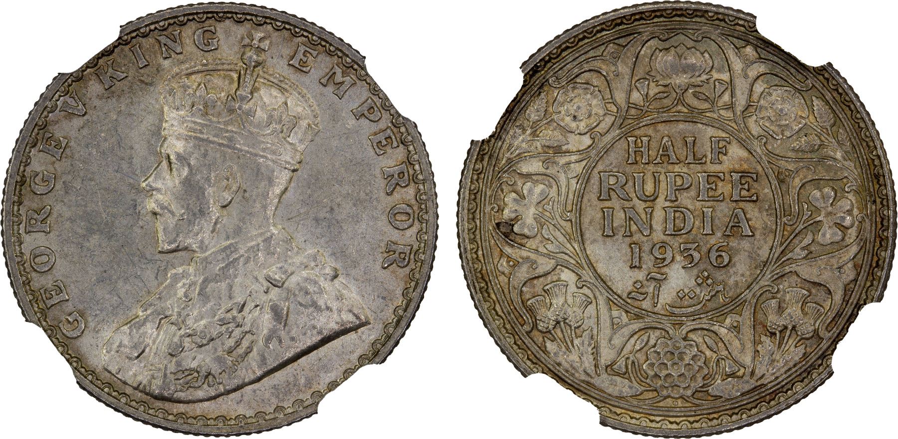 BRITISH INDIA: George V, 1910-1936, AR 1/2 rupee, 1936(b), KM-522, S&W-8.126, NGC graded MS62.