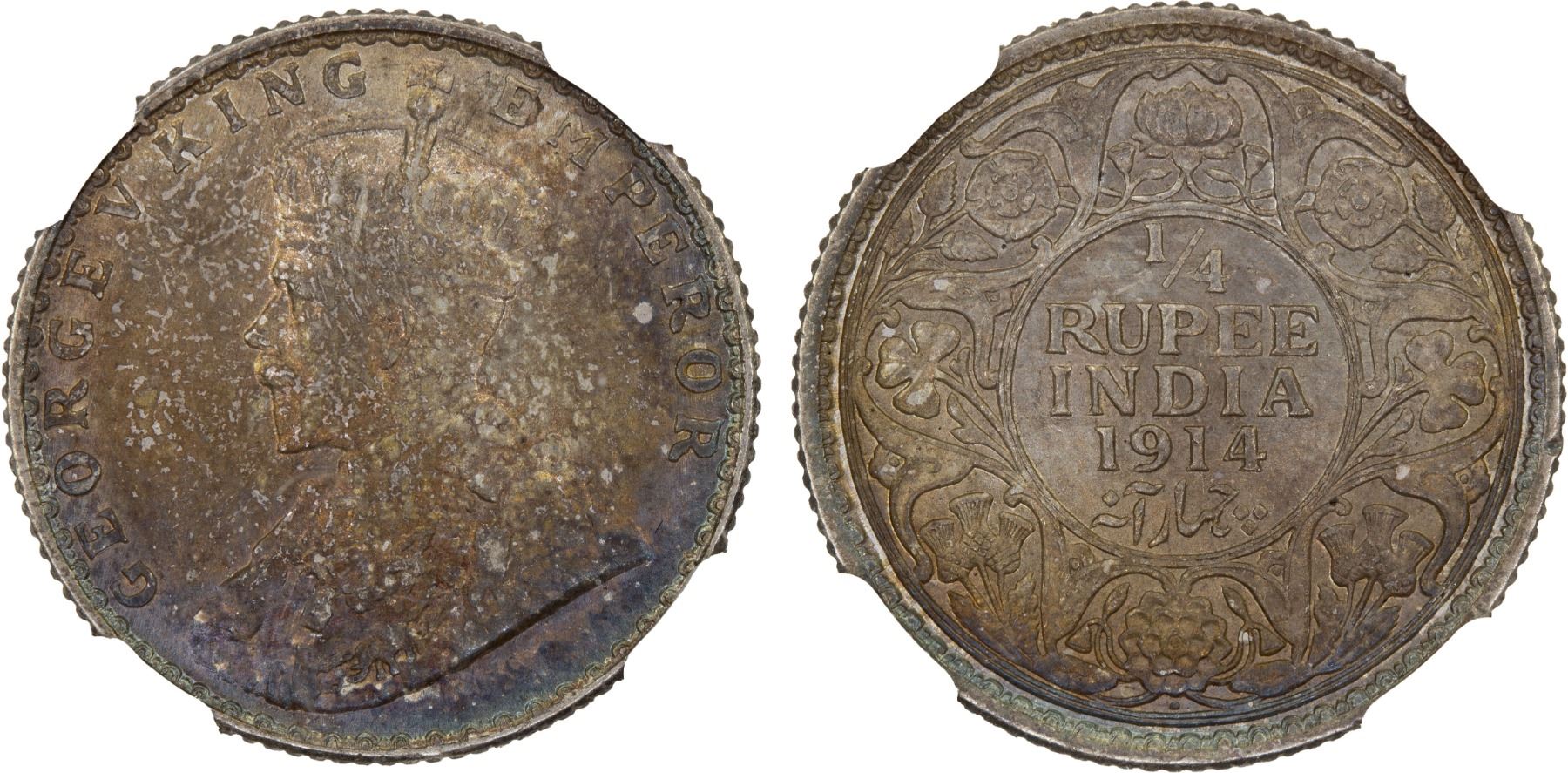 BRITISH INDIA: George V, 1910-1936, AR 1/4 rupee, 1914(b), KM-518, S&W-8.148, beautiful rainbow toning, NGC graded MS65, ex The 1914 Collection. Tied for finest graded at both NGC and PCGS.
