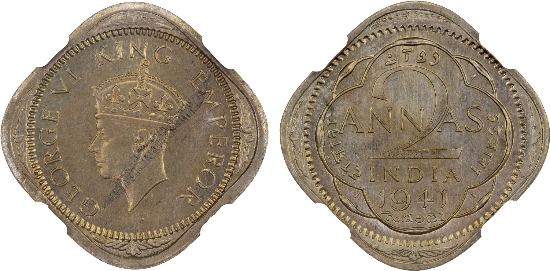 BRITISH INDIA: George VI, 1936-1947, 2 annas, 1941(b), KM-541, short trefoils in crown variety, a wonderful mint state example! NGC graded MS64.