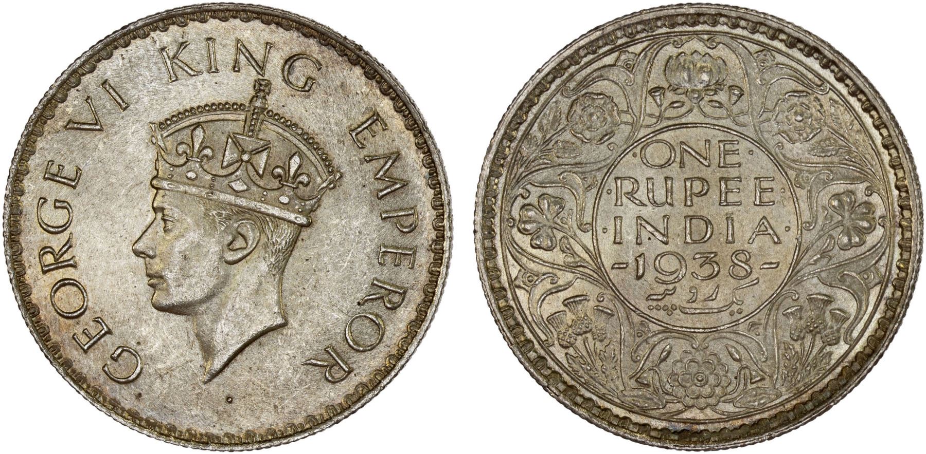 BRITISH INDIA: George VI, 1936-1947, AR rupee, 1938(b), KM-555, S&W-9.9, variety without dot, AU. All 1938 one rupee coins meant for circulation were minted in Bombay, with both with and without mint mark.