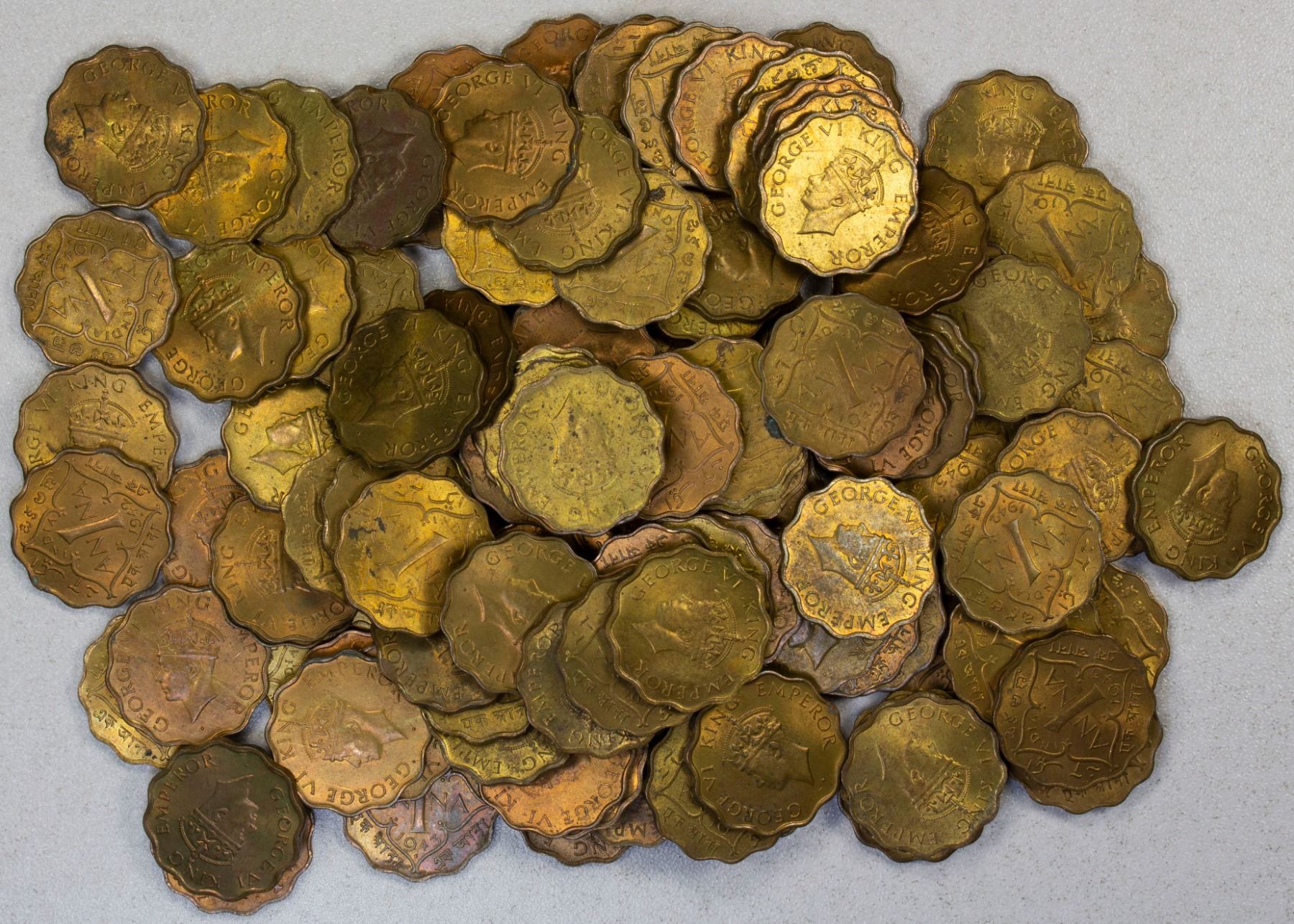 BRITISH INDIA: George VI, 1936-1947, LOT of 123 coins, large accumulation of nickel brass 1 anna coins from the Bombay and Calcutta mints, KM- 537a type dated 1942 to 1945, crowned head of King George VI facing left, denomination in English, Urdu, Telugu, Bengali & Hindi, lustrous mint state examples, UNC quality, retail value $600, lot of 123 coins.