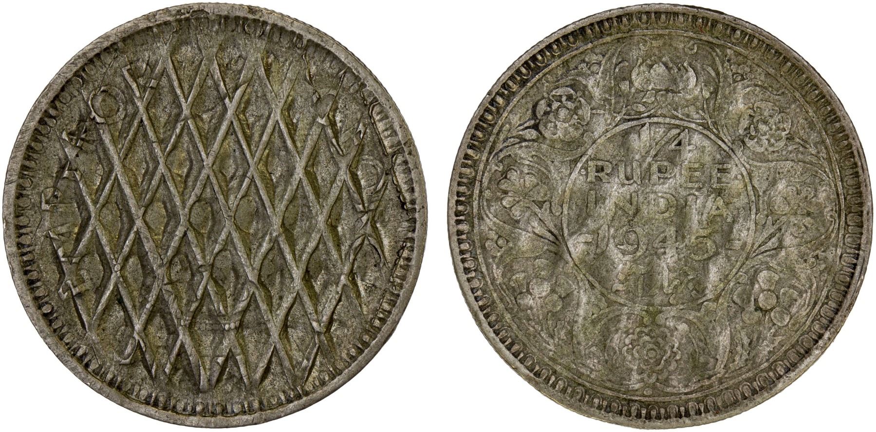 BRITISH INDIA: George VI, 1936-1952, AR 1/4 rupee, Bombay, 1945(b), cf. KM-547, official mint waffle cancellation, VF-XF. As the British were withdrawing silver coins from circulation in 1945, the coins were struck again with this waffle cancellation pattern. This was done on 1/4, 1/2, and one rupee coins. They were supposed to remain within the mint, but clearly some were able to sneak out.