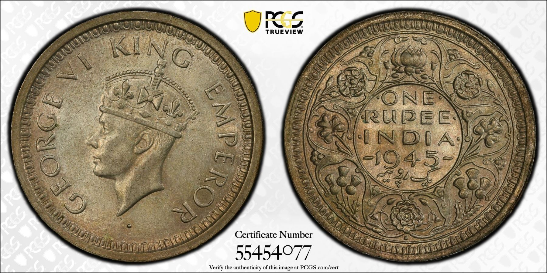 BRITISH INDIA: George VI, 1936-1952, AR rupee, 1945(b), PCGS MS62