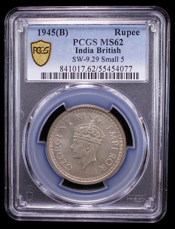 BRITISH INDIA: George VI, 1936-1952, AR rupee, 1945(b), KM-557.1, SW-9.29, small 5 variety, an attractive example, PCGS graded MS62.