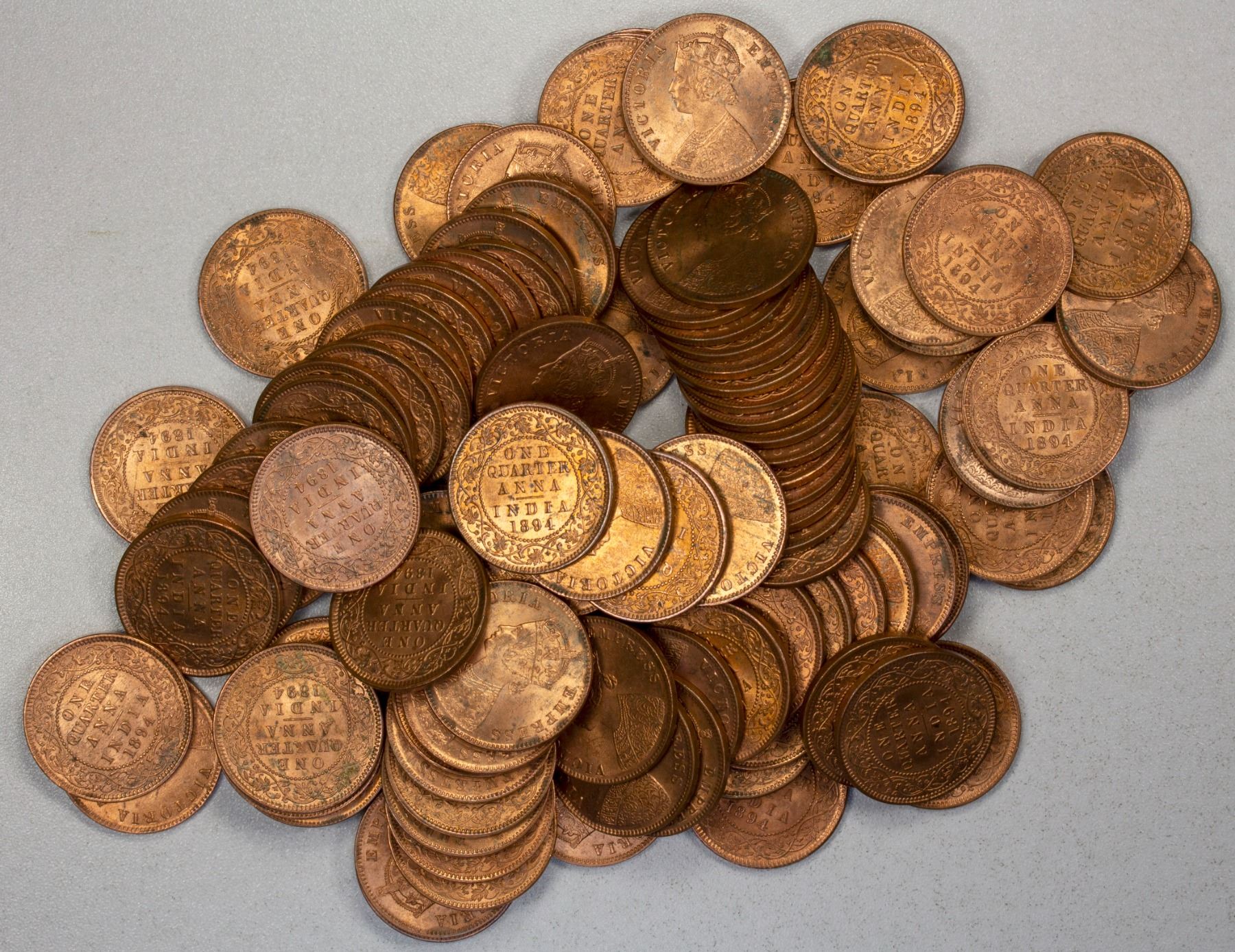 BRITISH INDIA: LOT of 106 coins, large accumulation of AE 1/4 anna coins dated 1894 from the Calcutta mint KM-486 type, all with red luster, AU-UNC quality, retail value $2500, lot of 106 coins.