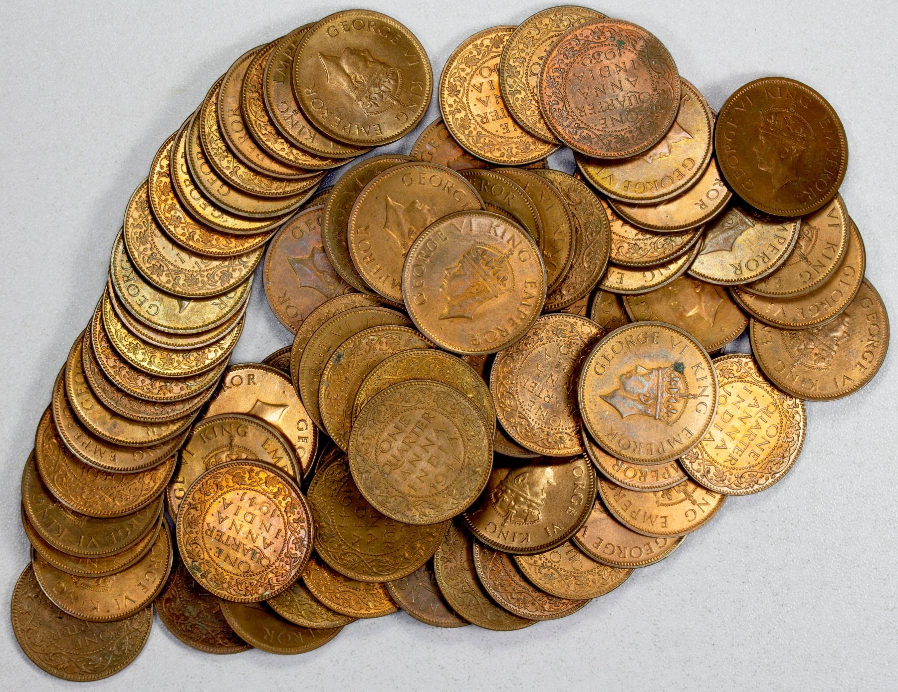 BRITISH INDIA: LOT of 81 coins, group of mint state George VI bronze 1/4 anna coins dated, 1939, 1940, 1941 and 1942, all lustrous example with light tone, a wonderful group of UNC quality coins, retail value $650, lot of 81 coins.