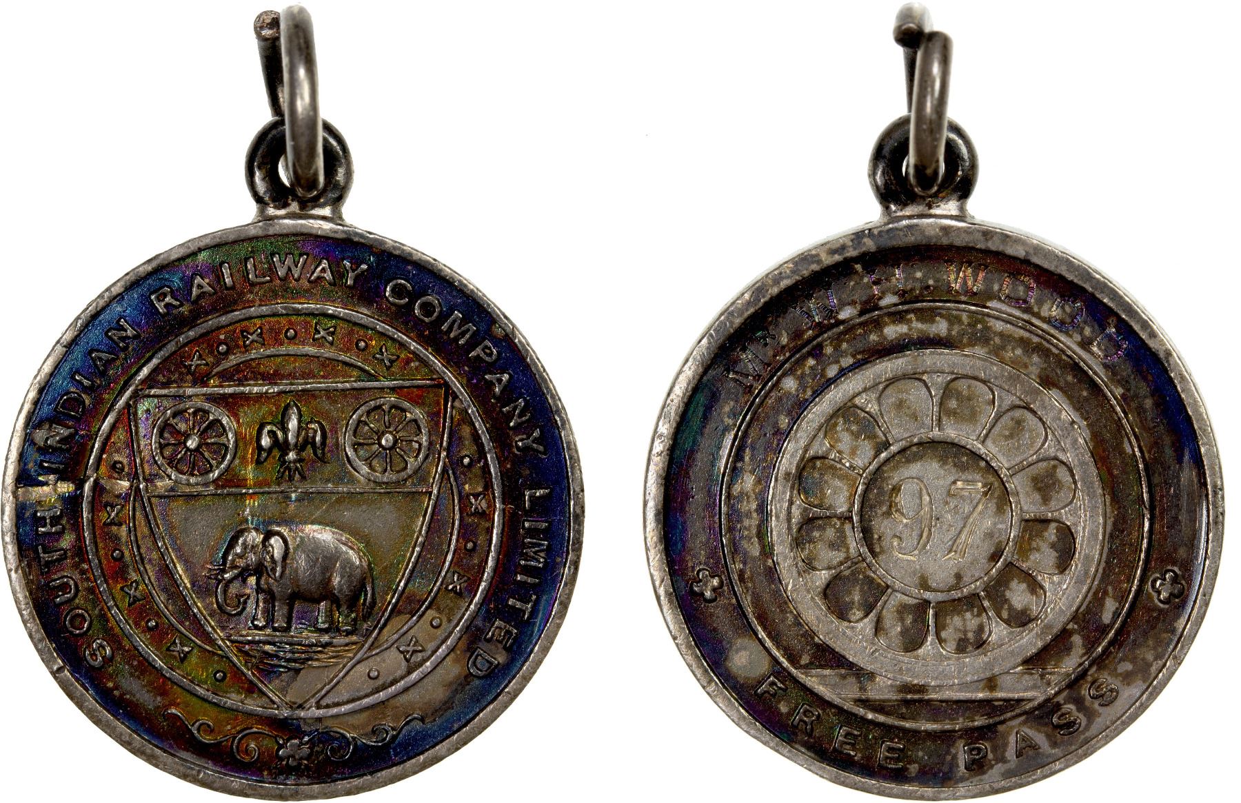 BRITISH INDIA: South India Railway Co. Ltd. AR free pass (9.29g), ND (ca. 1890), 24mm silver free pass for the South India Railway Co., arms of the company (including elephant) within inner circle, with SOUTH INDIAN RAILWAY COMPANY LIMITED around // floral-shaped motif with "97" engraved on blank center, all within inner circle with "(engraved) Mr W. H. WOOD - FREE PASS" around, with integral loop and ring, plain edge, with wonderful rainbow toning, especially on the obverse, AU, RR, ex Henry Christensen, Inc. (with old envelope). Engineer W.H. Wood was one of the very highest ranking S.I. Railway directors. He remained in India until at least 1911, when he and his wife were invited to the Coronation of George V.